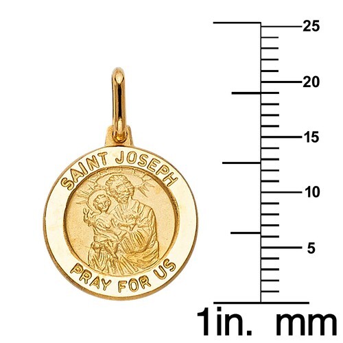 This exquisite saint medallion, masterfully crafted from radiant 14-karat yellow gold, captures the essence of devotion with its captivating round shape, perfectly showcasing the image of Saint Joseph. Encircling this divine figure are the heartfelt words 'Saint Joseph Pray For Us,' inviting a sense of faithful reflection. Measuring an elegant 0.63 inches in length, this pendant merges artistry and spirituality seamlessly. It comes adorned with a complementary 14k yellow gold 0.8-mm square wheat chain, allowing you to select from various lengths ranging from 16 to 22 inches.