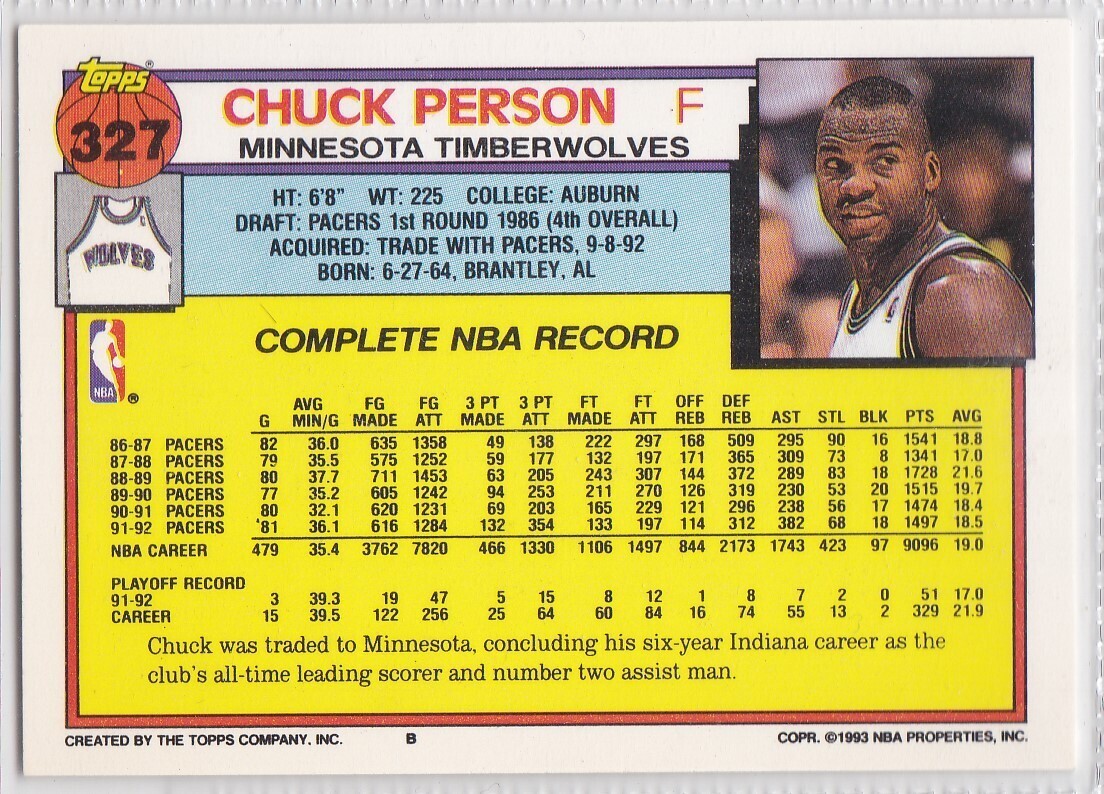 M) 1992-93 Topps Basketball Trading Card - Chuck Person #327