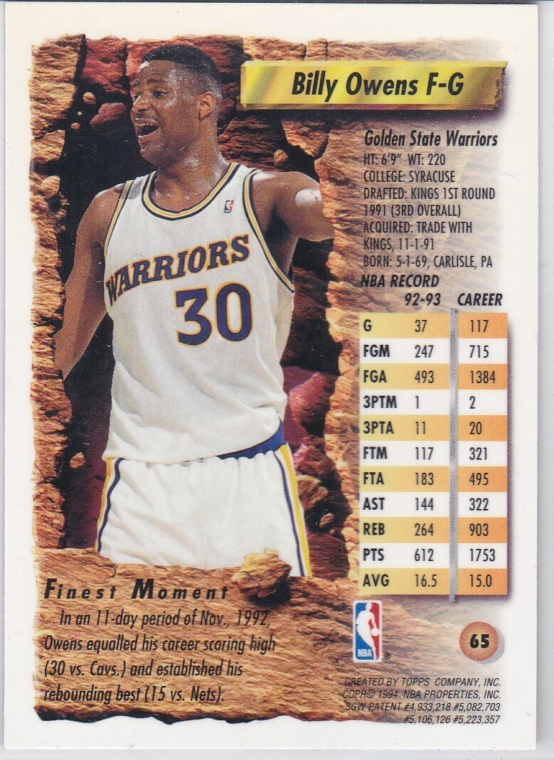 M) 1993- 94 NBA Topps Finest Basketball Trading Card Billy Owens #65