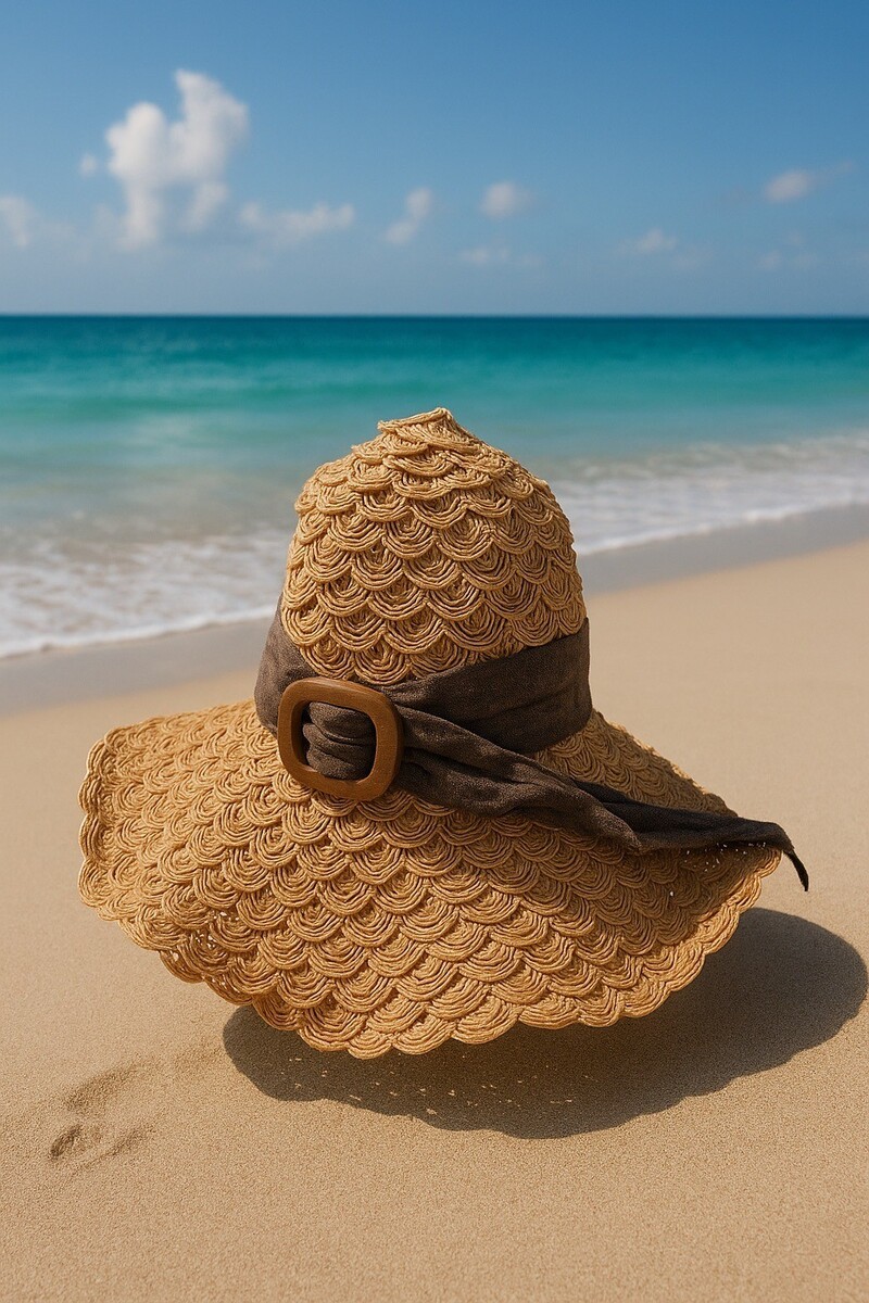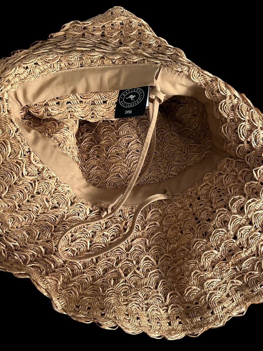 Chic and lightweight woven sun hat from Wallaroo Hat Company in the Emma style. Features a scalloped paper-braid design, a soft brown fabric band with wood-look buckle, and an inner drawstring for adjustable fit. Stylish, breathable, and perfect for beachwear, garden days, or travel.