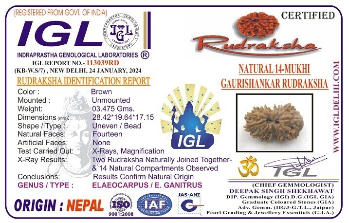 Rare 14 Mukhi Gauri Shankar Rudraksha - 28.42 mm - Nepal - IGL Certified