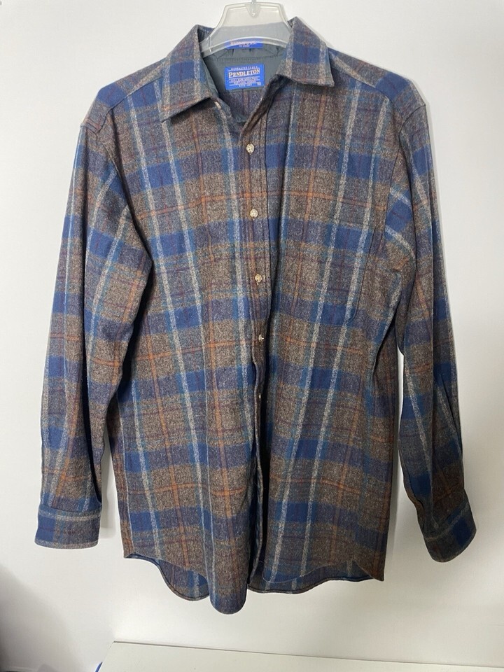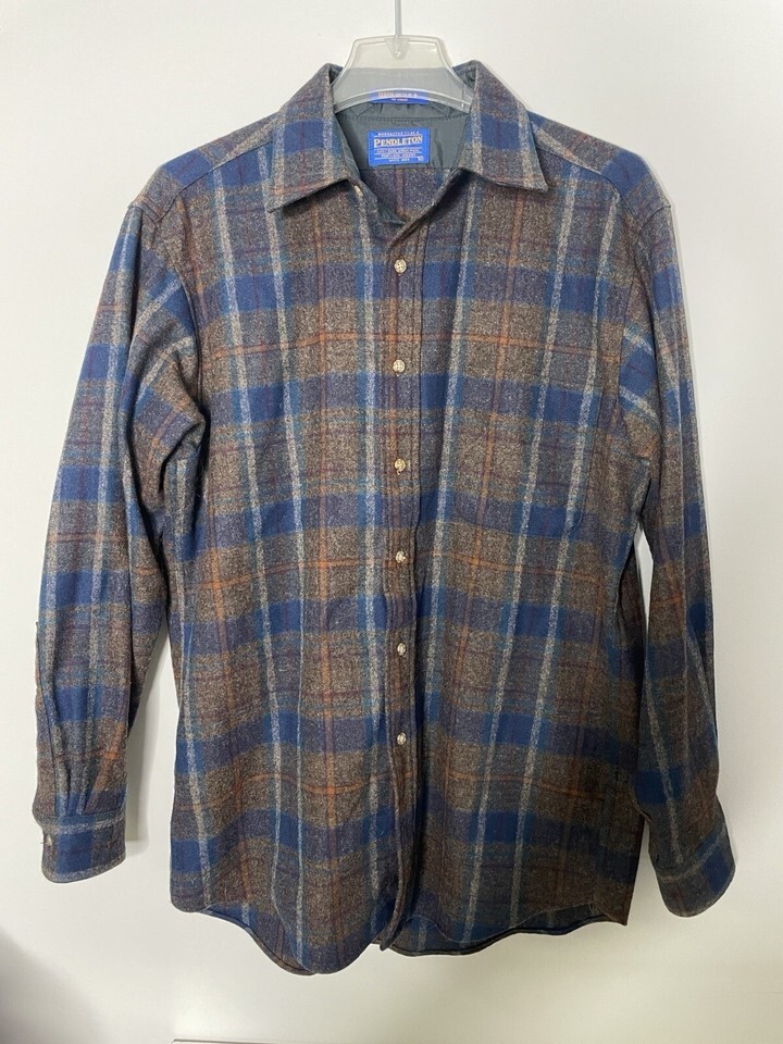 Vintage Pendleton Virgin Wool Button Down Flannel Shirt Medium Brown Blue Plaid