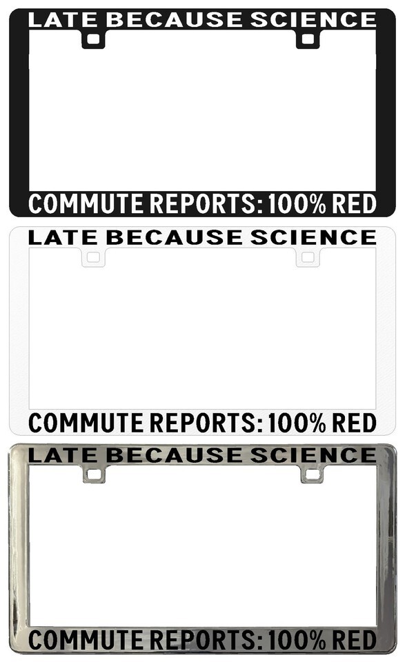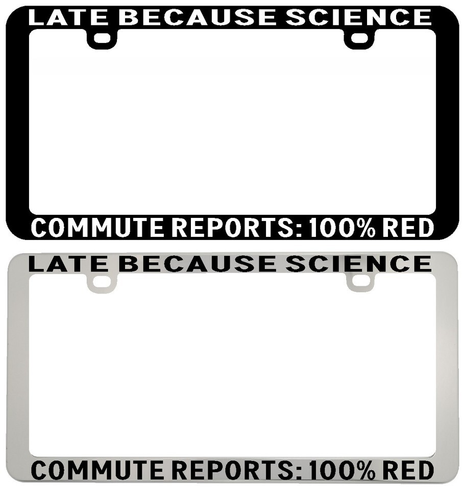 LATE BECAUSE SCIENCE COMMUTE REPORTS: 100% RED. License Plate Frame