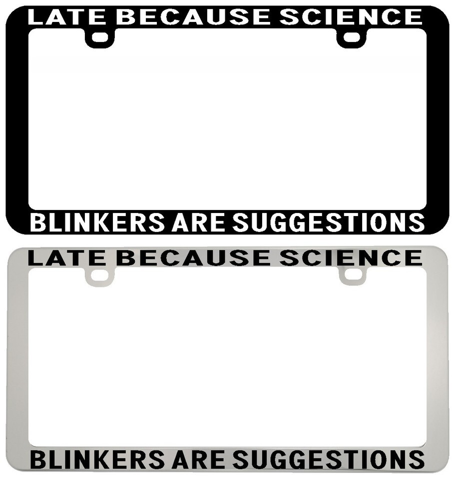 LATE BECAUSE SCIENCE BLINKERS ARE SUGGESTIONS. License Plate Frame