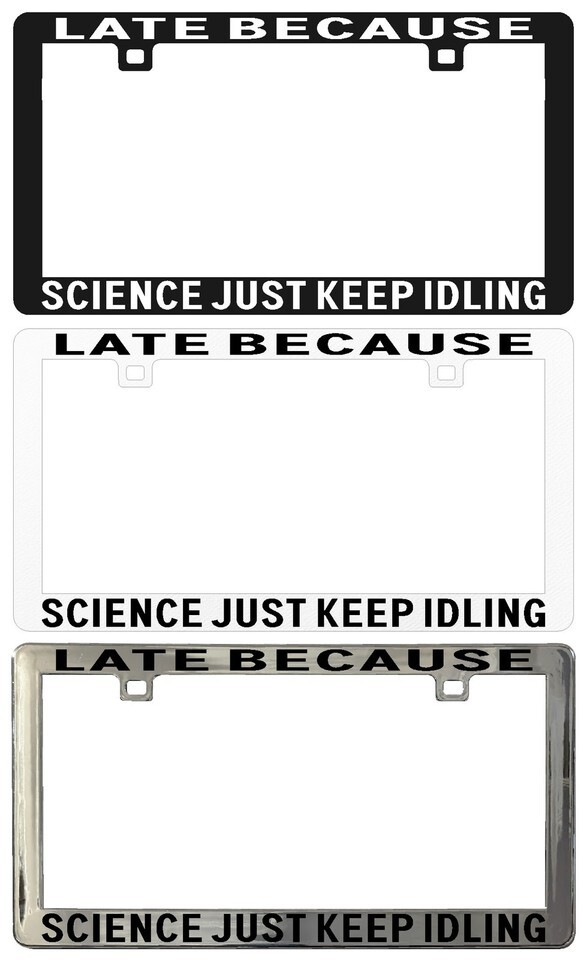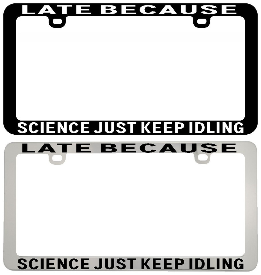 LATE BECAUSE SCIENCE JUST KEEP IDLING Assorted Legal License Plate Frame