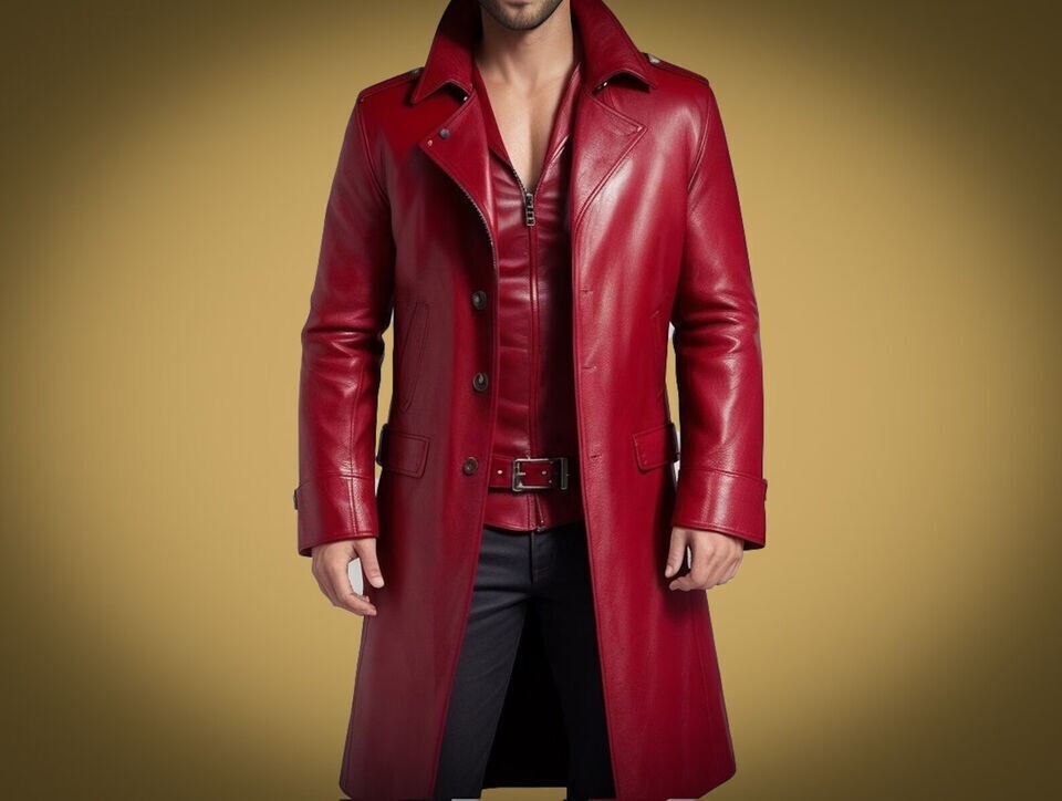 Elegante gabardina de cuero de piel de cordero original ROJO para hombre hech...