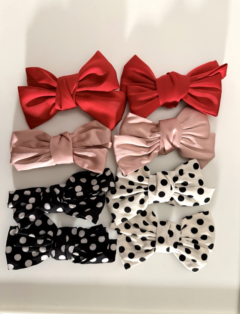 Add a pop of color and vintage flair to your favorite heels, flats, or loafers with this lot of 8 XunYee satin bow shoe clips. Set includes four matching pairs in bright red, blush pink, black with white polka dots, and white with black polka dots, each with silver-tone clip backs that attach easily to shoe fronts, sides, or straps. These oversized bows look adorable for parties, date nights, cosplay, and holiday outfits, and can also be clipped to bags, belts, or headbands for extra styling options?perfect little accents for festive Christmas and New Year looks.