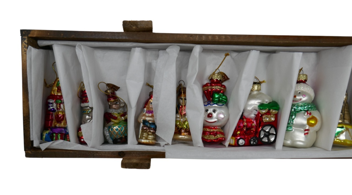 The Thomas Pacconi Classics Blown Glass Christmas Ornaments set includes 12 ornaments. Each ornament is hand-blown and crafted with art glass techniques, making them a unique and decorative addition to any Christmas collection. The Thomas Pacconi brand ensures high quality and craftsmanship, perfect for those looking to add a touch of nostalgia to their holiday decor. These will come in a wooden crate.