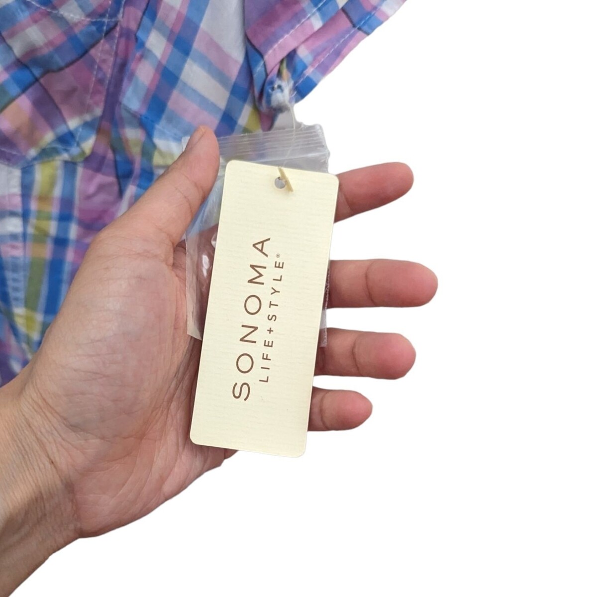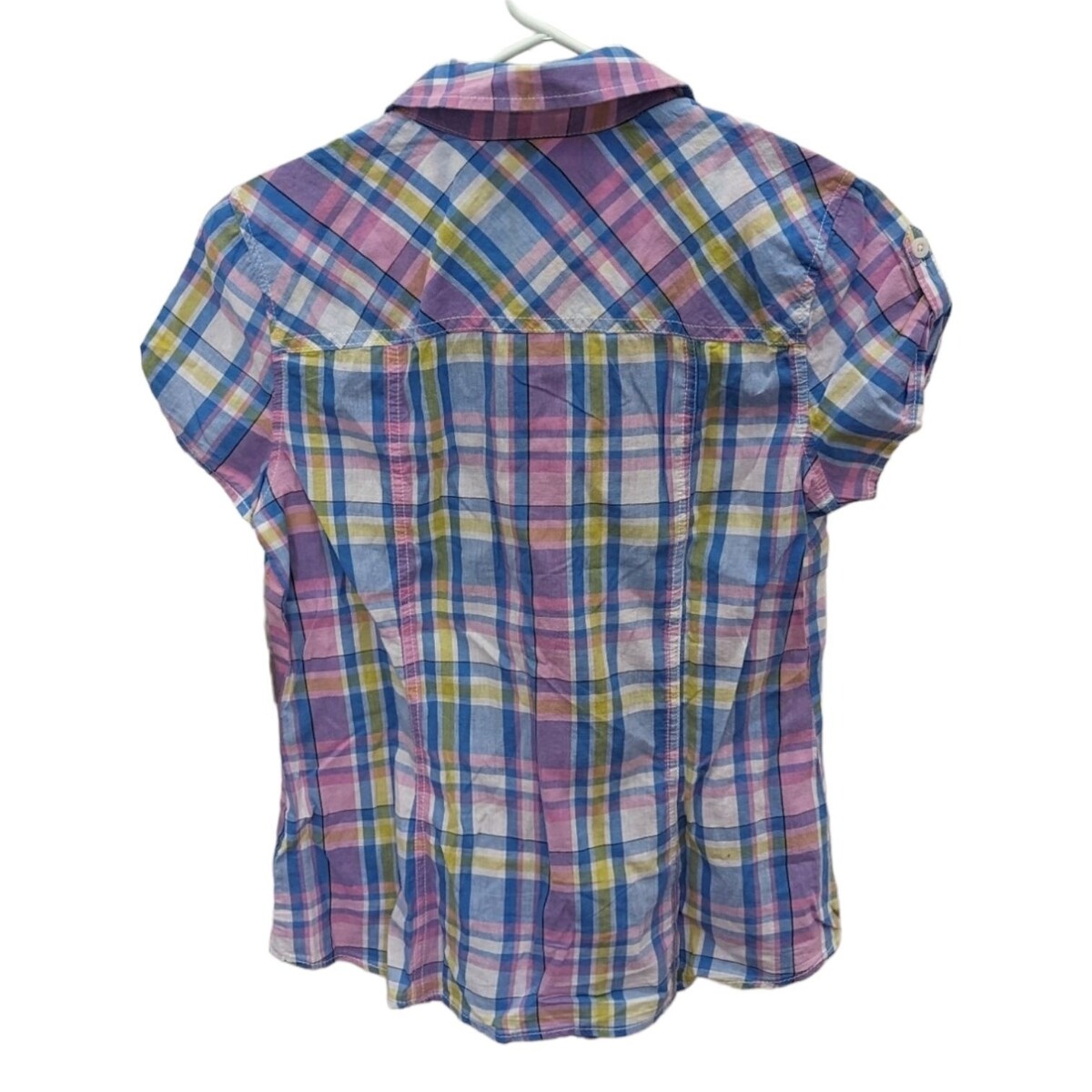 Vintage Y2K Pink Blue Plaid 100% Cotton Short Sleeve Button Front Blouse Top XS