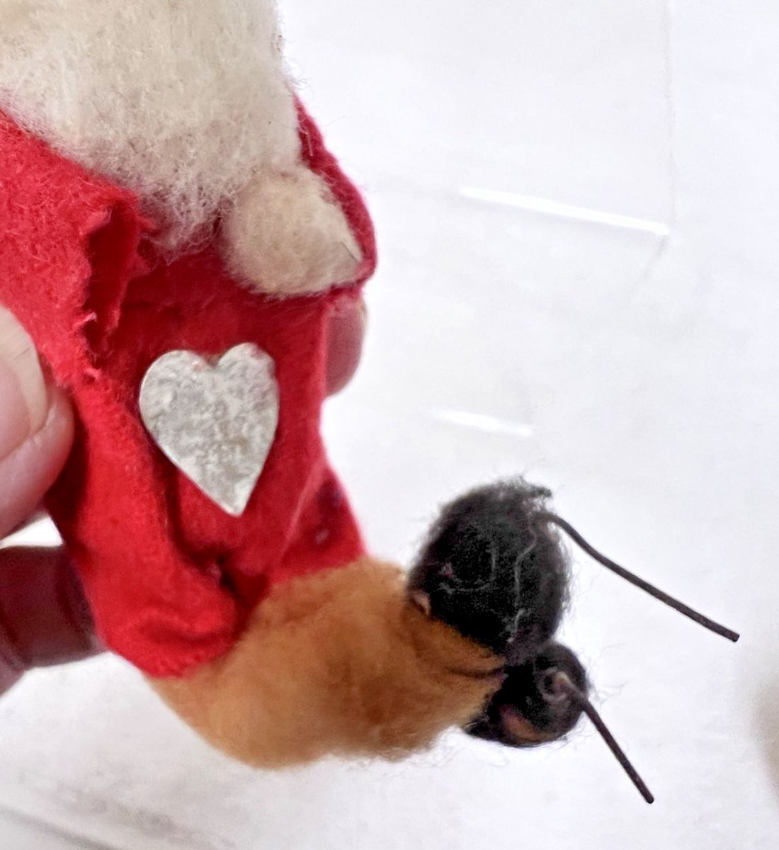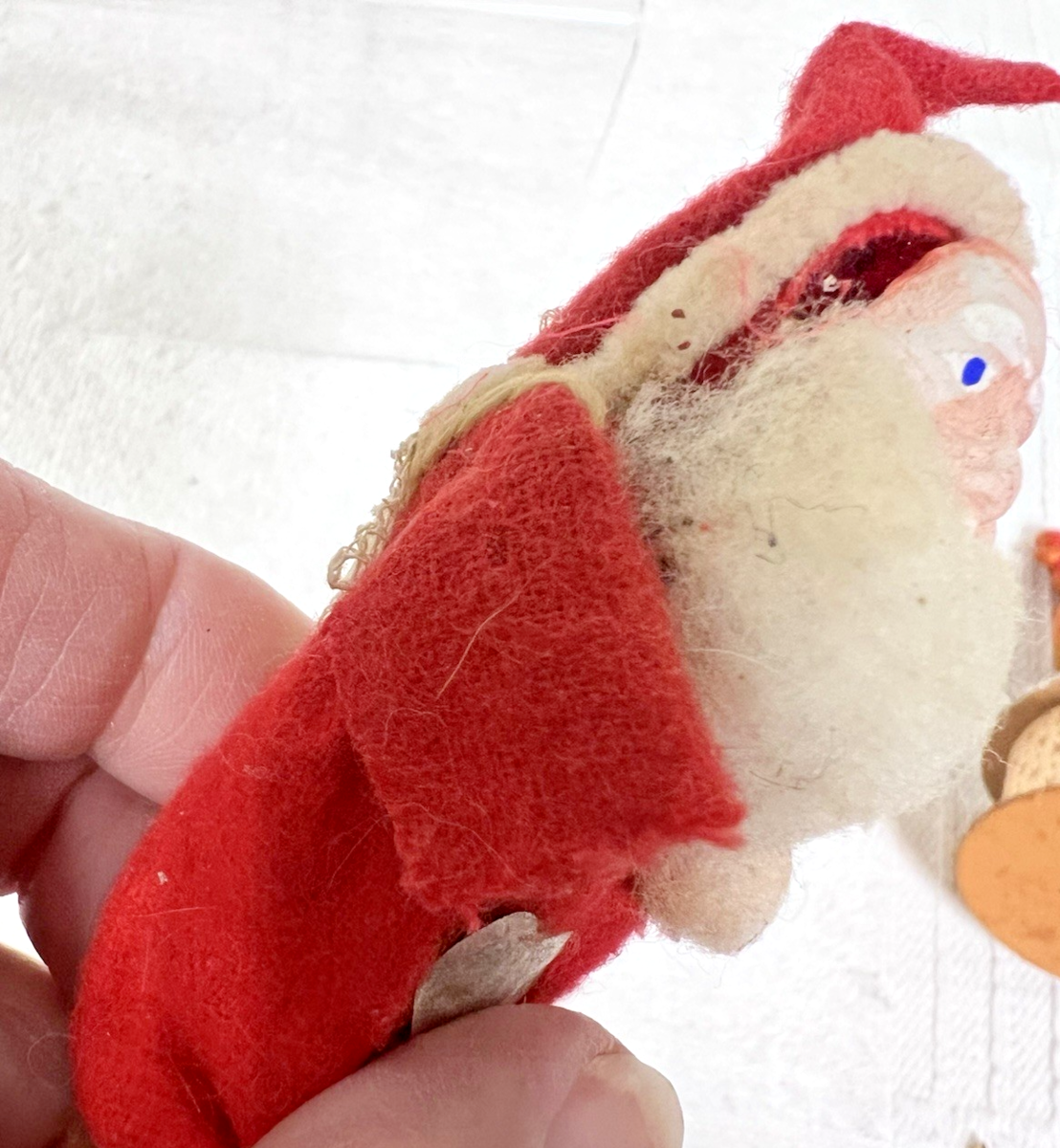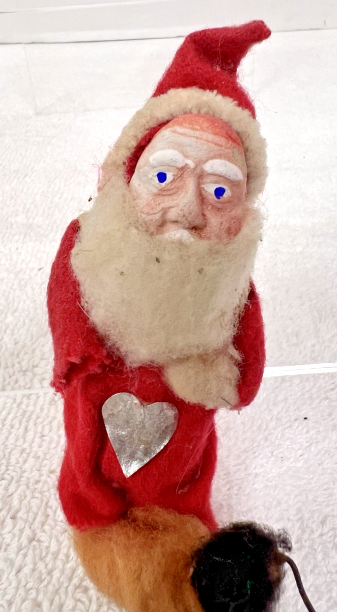 Antique Plaster Face Santa Cotton Beard Full Body Silver Foil Heart Net Pack about 3.5 ish long he is missing one tony arm/hand (someone can replace that I'm sure) the front of his red shirt has a foil heart and the net pack on his back also has foil. The face is clay he is sweet!