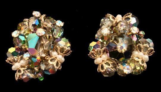 Vintage RETRO Earrings Green Aurora Borealis Crystal Pearl Clip-On 1950S
