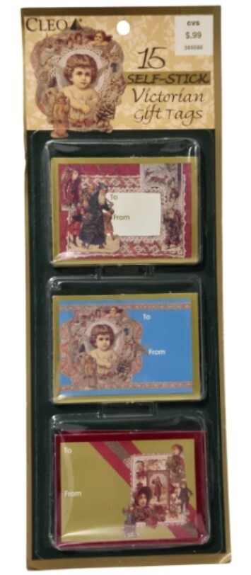 This item is a package of vintage Cleo 15 self-stick Victorian gift tags. Cleo gift tags were a product line by Gibson Greeting Cards.