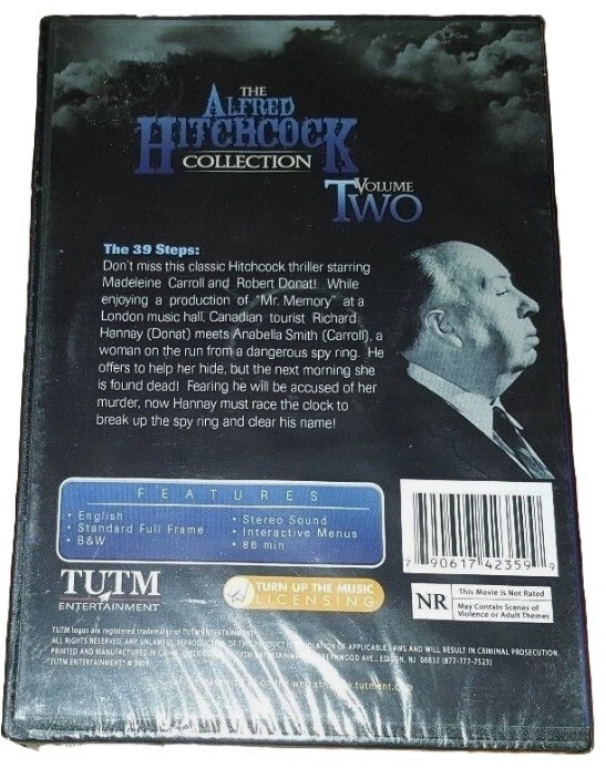 Description of item: Experience a classic Hitchcock thriller with The Alfred Hitchcock Collection: Volume Two, featuring the suspenseful masterpiece The 39 Steps. This edition follows Richard Hannay, an ordinary man thrust into a world of espionage after a mysterious woman turns up dead and he becomes the prime suspect. Racing across England to clear his name, Hannay must unravel a spy ring while staying one step ahead of both the police and a dangerous enemy. Presented in black and white with standard full-frame format and stereo sound, this volume captures Hitchcock?s trademark tension and atmosphere, making it a must-have for fans of vintage suspense cinema.