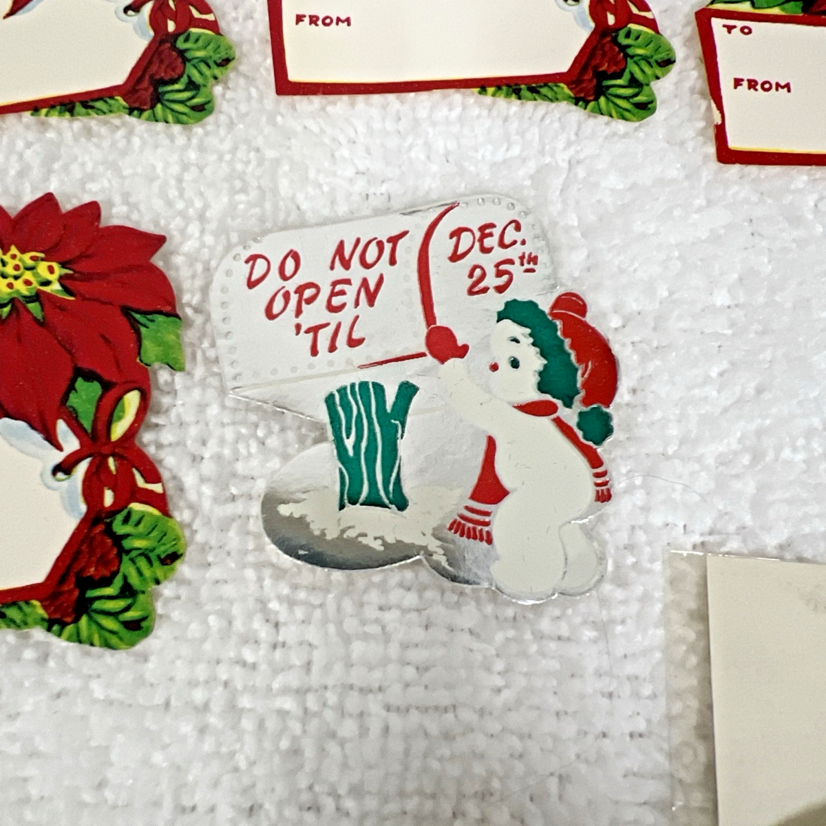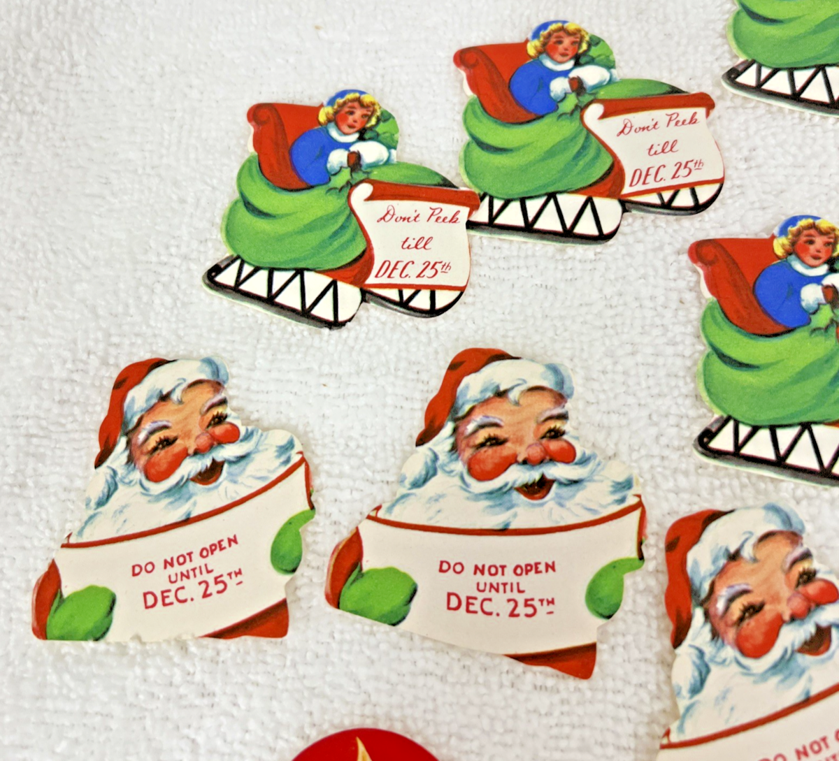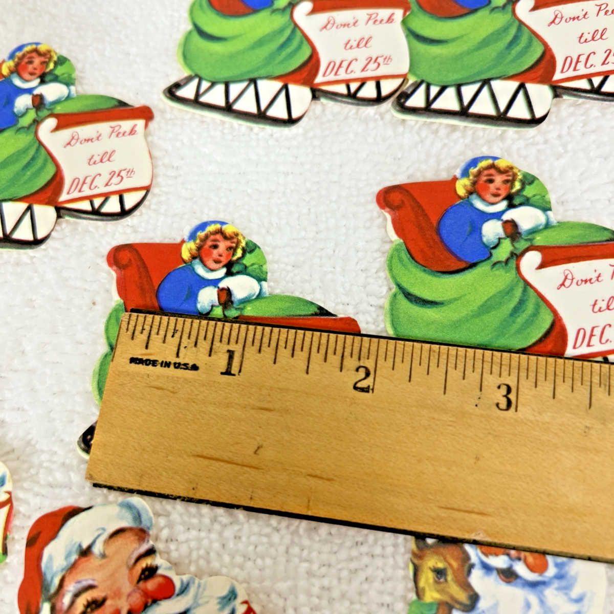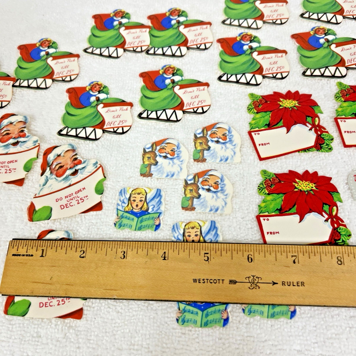 39 Vintage Christmas Tags Do Not Open Gummed Seals Sled Santa Poinsettia Star