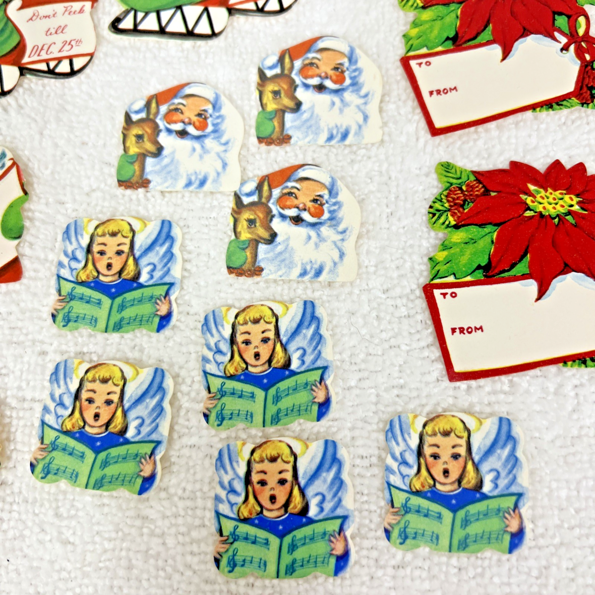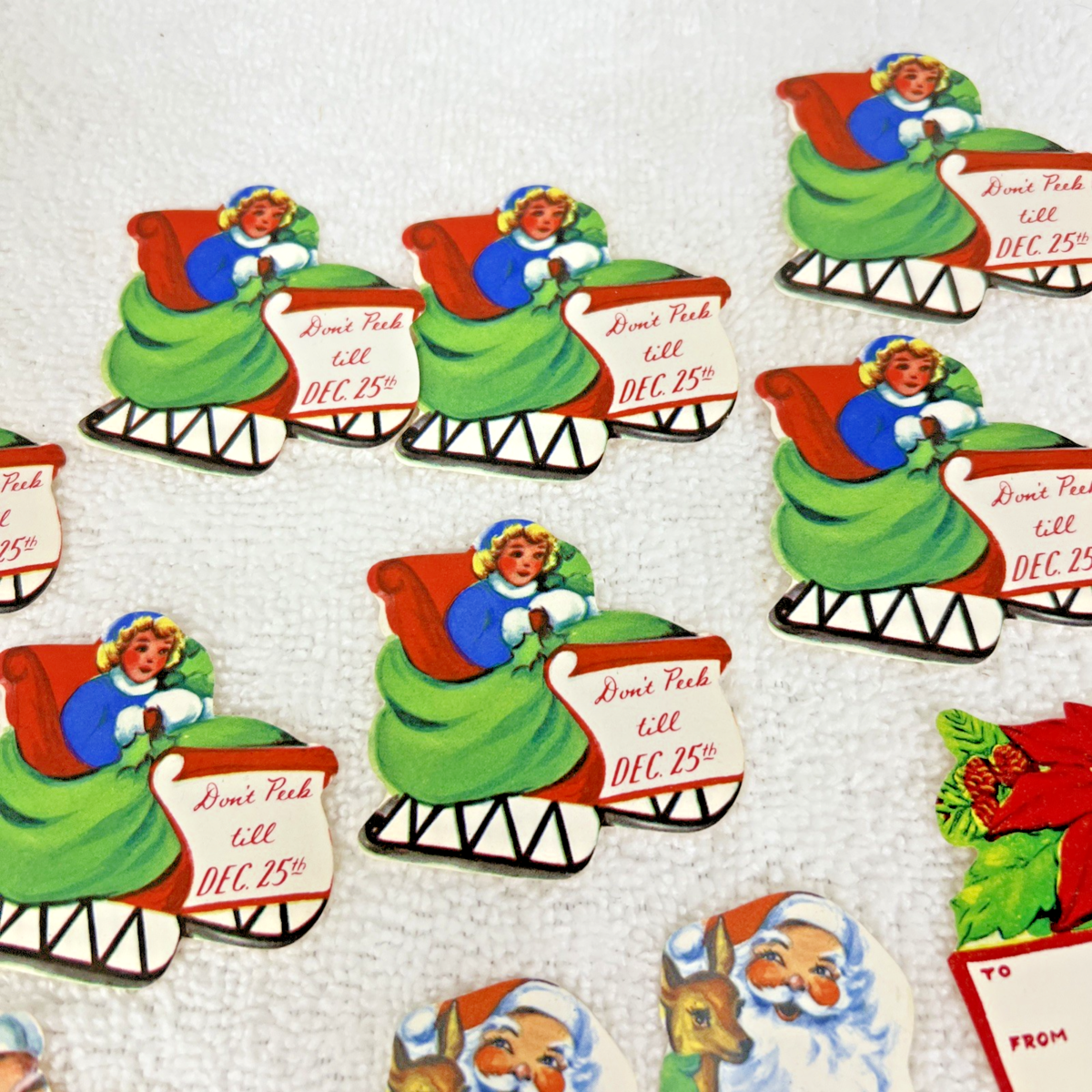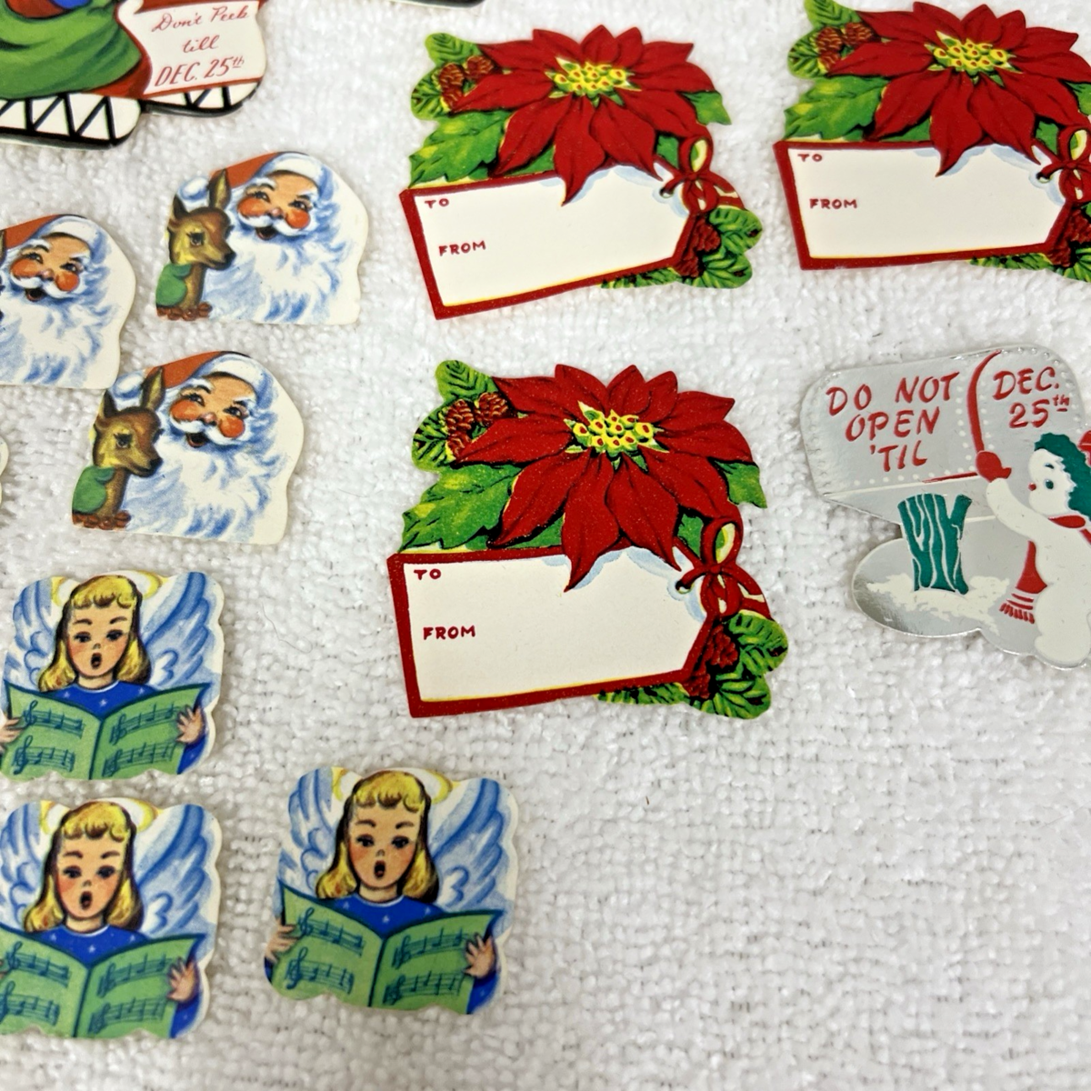 39 Vintage Christmas Tags & Do Not Open Gummed Seals Sled Santa Poinsettia Star