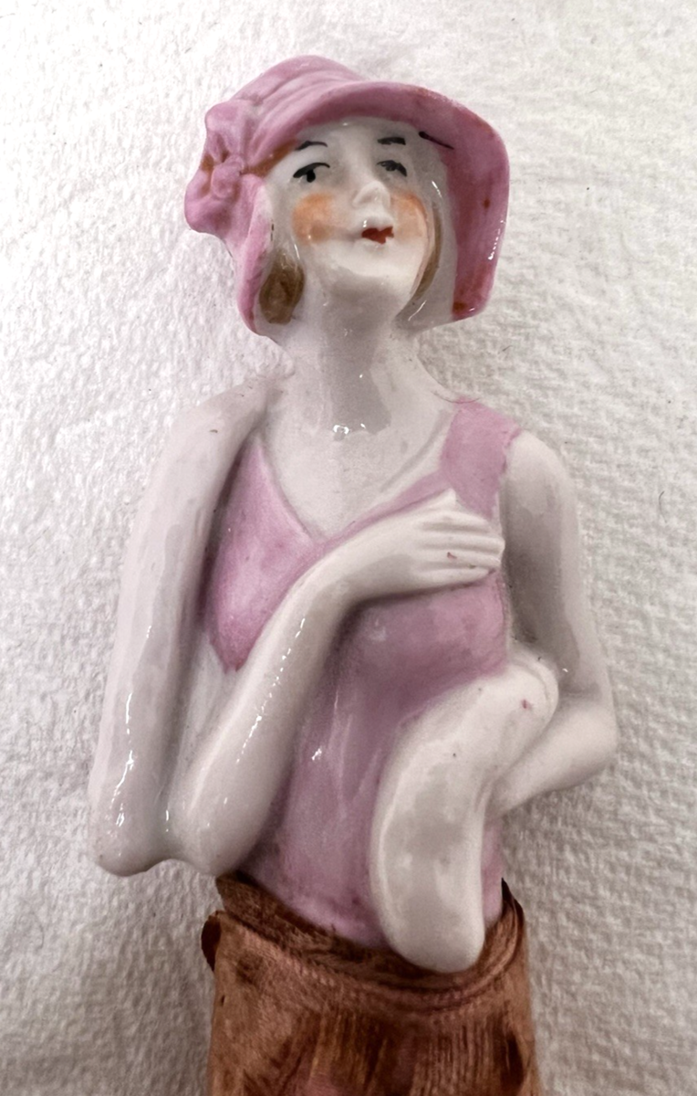 Antique Germany Arms Away 1/2 Flapper Doll Pink w Fur Stole Brush Handle 5 3/4"