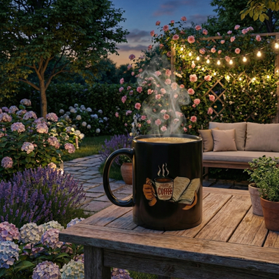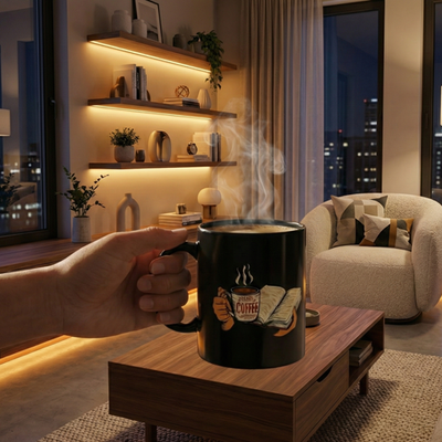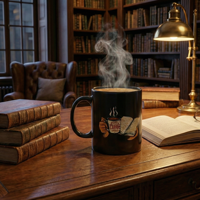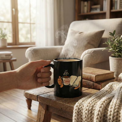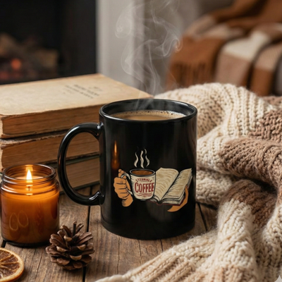 Warm mornings with a good book and a strong cup of coffee come alive on this glossy black ceramic mug. The artwork shows hands cradling an open book and a steaming mug labeled ?coffee,? rendered in rich, warm tones that pop against the deep black background. It?s the kind of mug that slips into a quiet routine ? early reading light, the first sip that nudges awake, a bookmarked chapter that waits patiently. Lightweight but sturdy, the C-handle fits comfortably in your hand while the glossy finish keeps the colors vivid. Whether used at a kitchen table, a bedside stand, or a favorite reading nook, this mug brings a small, sincere moment of comfort to everyday mornings and late-night chapters.