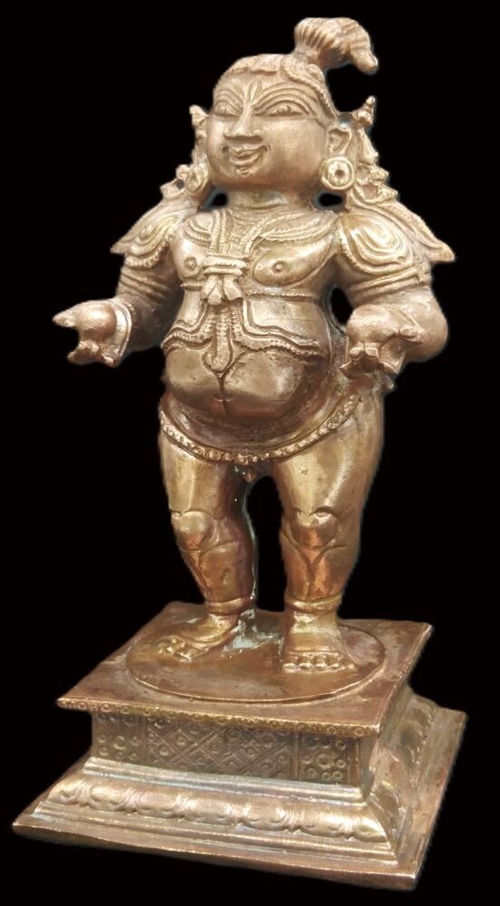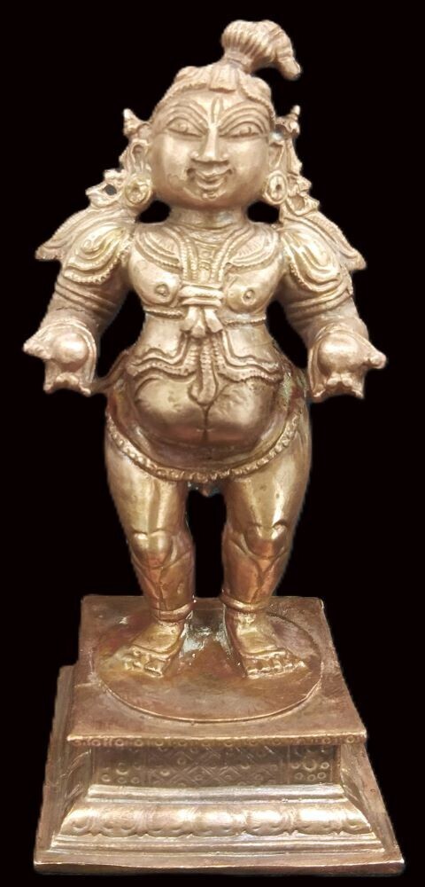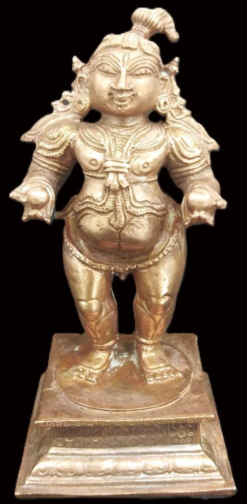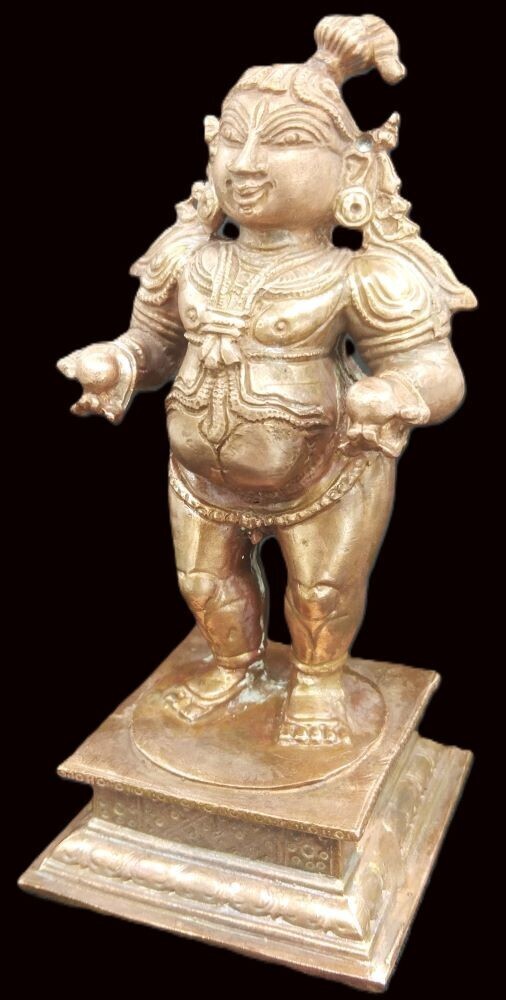 Design : This Copper statue of Bala Krishna is very impressive made in the hoysala style from artisians of south india with ornate jewelry including decorative belt across his waist and hold the butter balls.