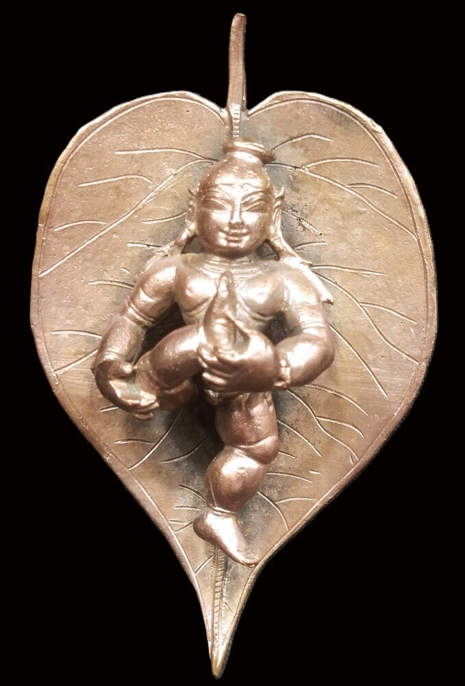 This Copper statue of Bala Krishna on Leaf is very impressive made in the hoysala style from Skilled artisians of south india .