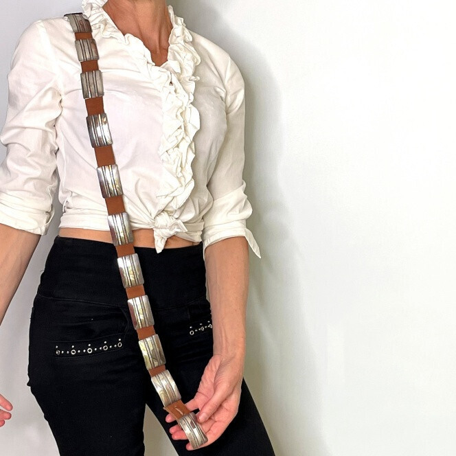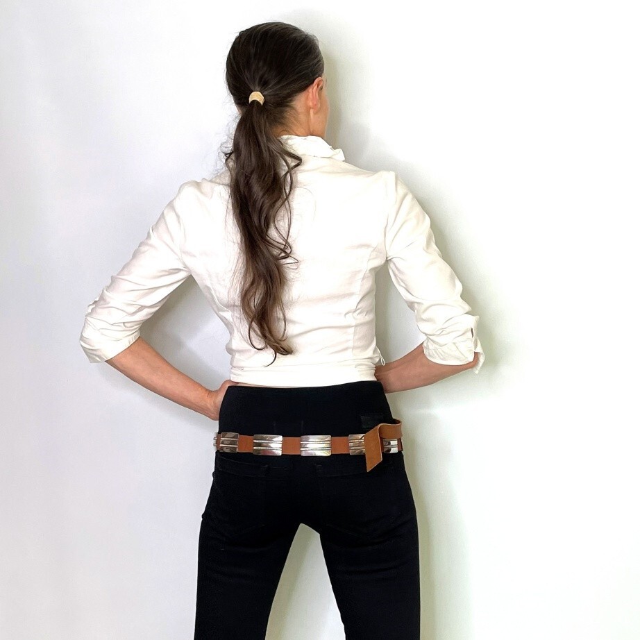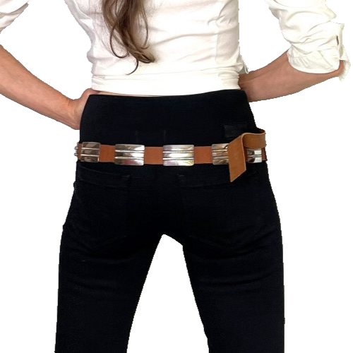 This lovely belt includes a buckle and 12 hand made conchos. The conchos can each separately move along the belt. If desired these conchos and the buckle can be placed on a leather belt of any color or size required.