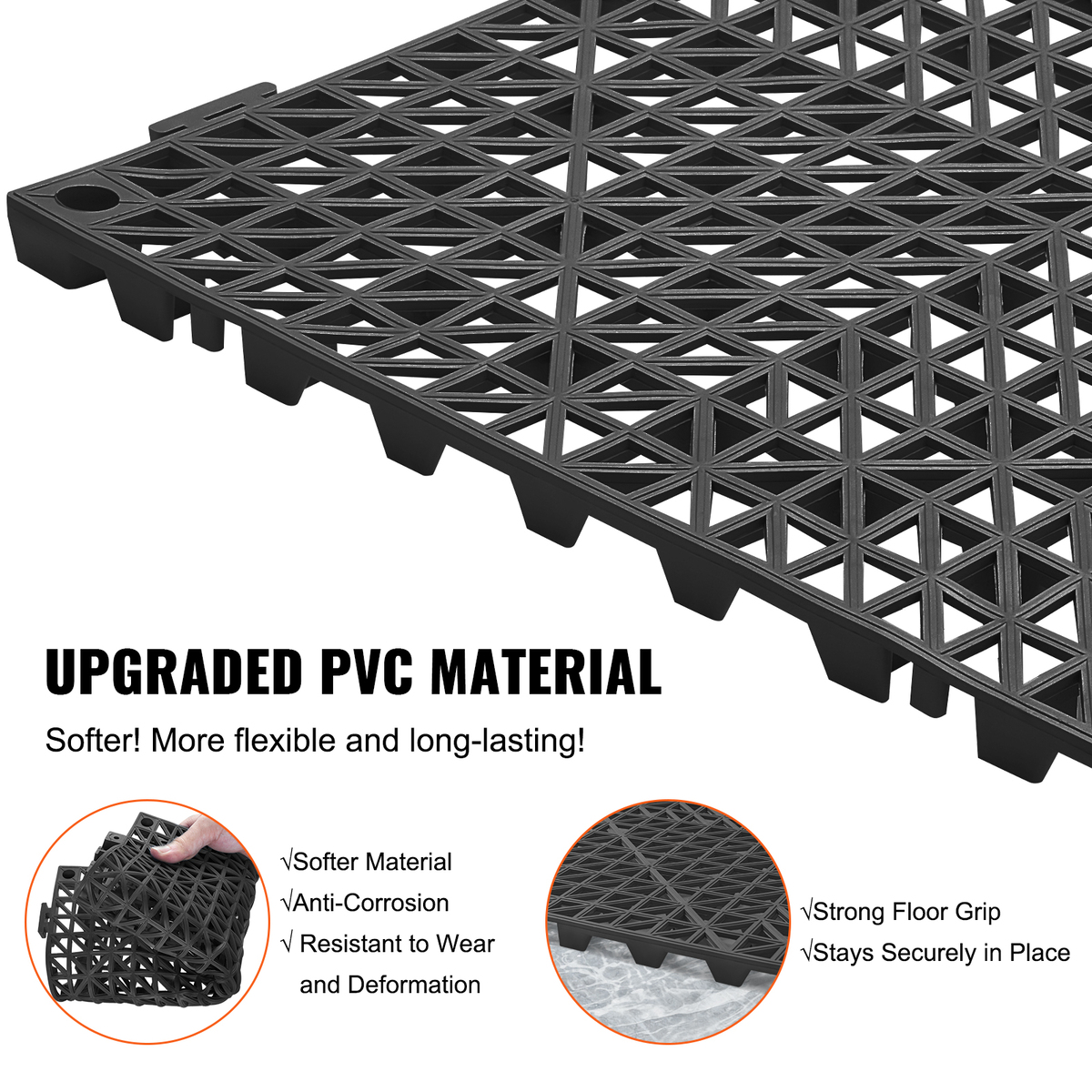 Durability and Flexibility: Crafted from upgraded PVC material, these modular interlocking cushions combine softness and toughness. They maintain their shape over time. The snug fit of the drainage holes ensures a firm grip, preventing them from coming loose.