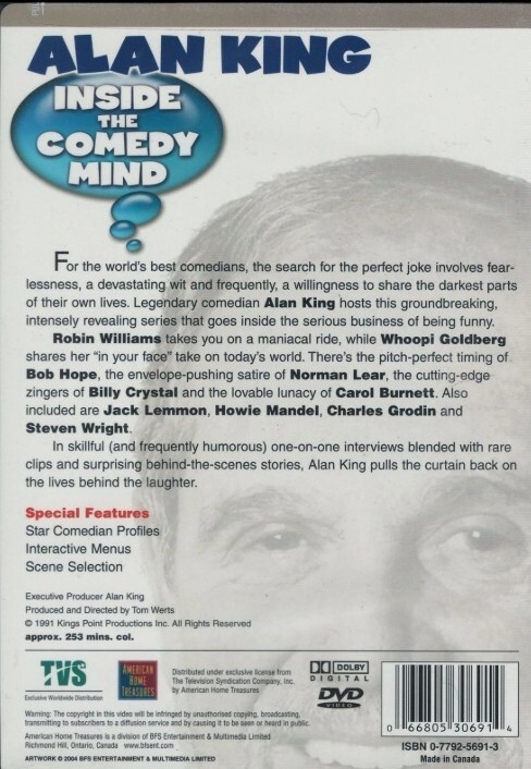 Description of item: Enjoy over four hours of comedy insight and unforgettable moments in Alan King: Inside the Comedy Mind, a rare Platinum Collection featuring 10 legendary performers. Hosted by iconic comedian Alan King, this acclaimed series offers candid, often hilarious one-on-one interviews that dive deep into the craft of comedy, spotlighting stars like Robin Williams, Billy Crystal, Whoopi Goldberg, Bob Hope, Jack Lemmon, Carol Burnett, Norman Lear, Howie Mandel, Charles Grodin, and Steven Wright. Blending revealing conversations with classic clips and behind-the-scenes stories, this collection celebrates the art, struggle, and brilliance behind some of the greatest comedic minds of our time. Includes special features such as star comedian profiles, interactive menus, and scene selection.