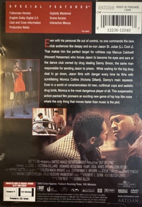 Description of item: Out of Sync is a gritty 1995 crime thriller starring LL Cool J as Jason St. Julian, a talented DJ whose life spirals out of control when he becomes entangled with corrupt cops, dangerous club owners, and a seductive femme fatale. After being pressured by a ruthless narcotics detective, Jason is forced into a dangerous undercover world where survival is never guaranteed. Packed with tension, action, and ?90s urban noir style, this film delivers a gripping story of betrayal, redemption, and survival. DVD includes special features such as scene access, cast crew info, English Dolby Digital 2.0, and digitally mastered video.