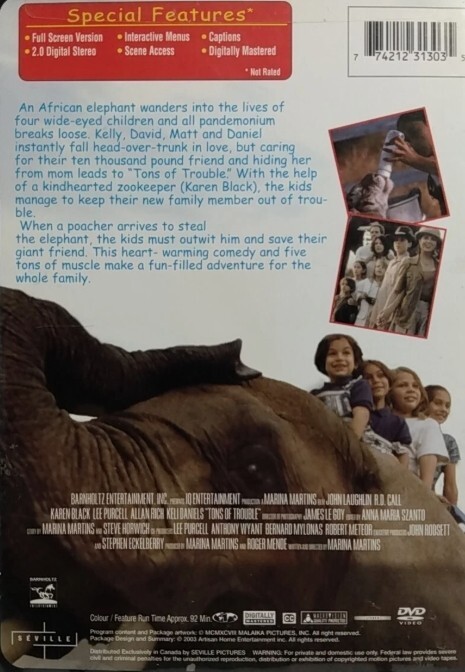 Description of item: Tons of Trouble is a heartwarming and funny family adventure that begins when four energetic siblings unexpectedly befriend a ten-thousand-pound elephant and instantly fall trunk-over-heels for their new companion. But caring for such a giant friend is no small task, and with the help of a kind zookeeper (Karen Black), the kids must work together to keep him out of trouble. When a poacher threatens to steal the elephant, the children band together to protect their loyal buddy, leading to a lively, jumbo-sized journey full of laughs, teamwork, and memorable moments the whole family can enjoy. DVD includes full screen version, interactive menus, scene access, captions, and digitally mastered audio.