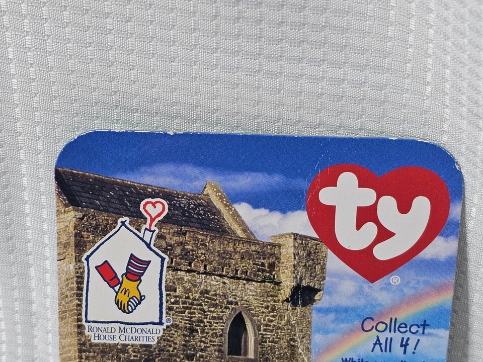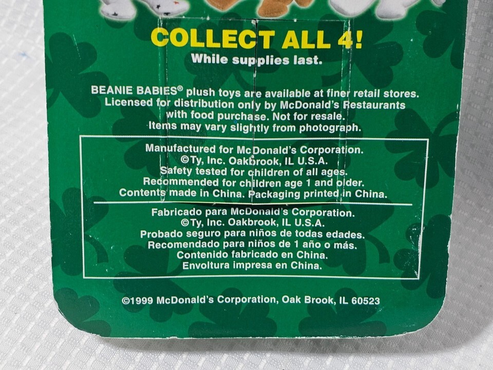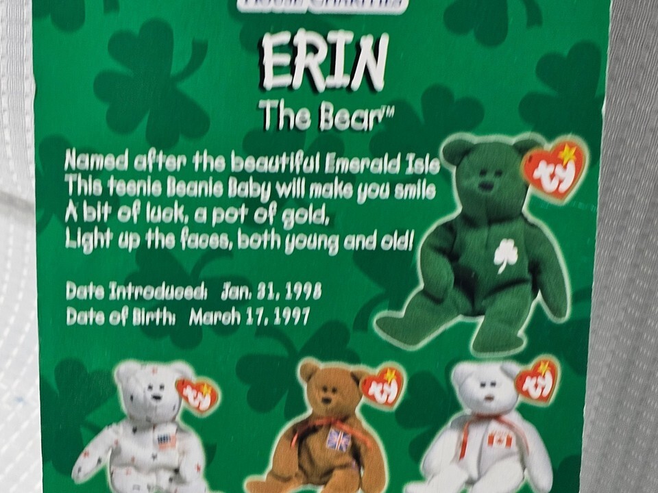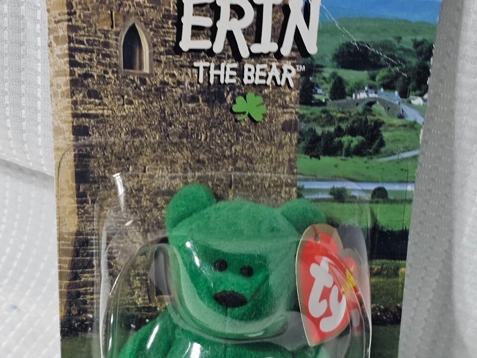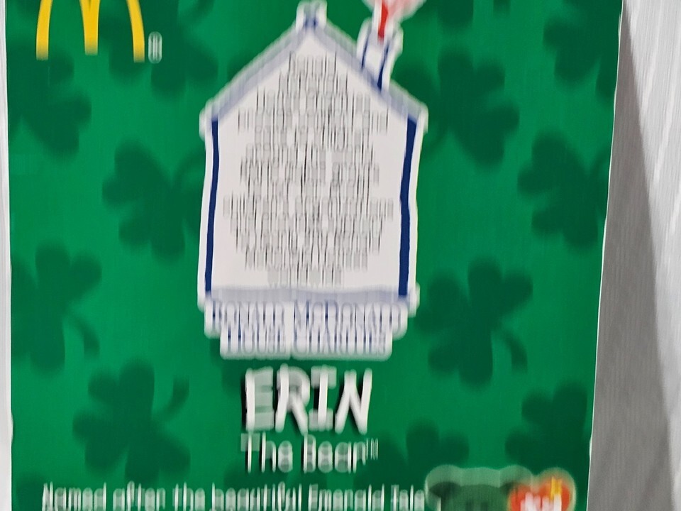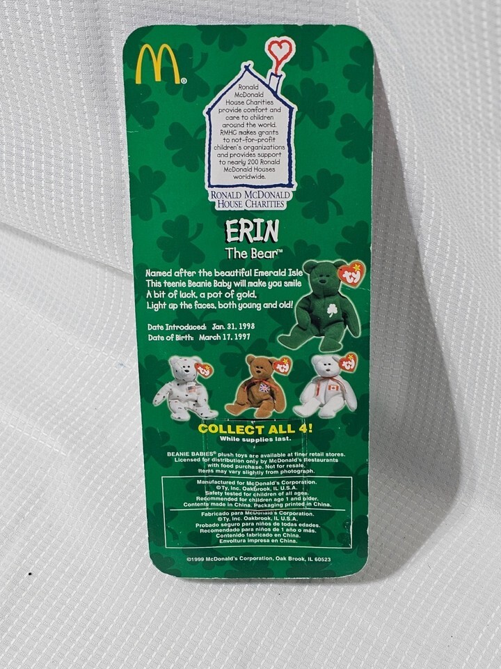 Description of item: Celebrate Irish charm with Erin the Bear, one of the original McDonald?s Ty Beanie Babies released in partnership with the Ronald McDonald House Charities. Featuring a rich green color and a white shamrock emblem on its chest, Erin embodies the spirit of Ireland and good luck. This collectible mini Beanie Baby remains factory sealed in original packaging, never opened or displayed. The packaging shows some light surface wear and a crease on the card from storage, but the bear itself is mint inside the blister pack. A great addition for any Ty Beanie Baby collector or fan of nostalgic McDonald?s promotions from the late 1990s.
