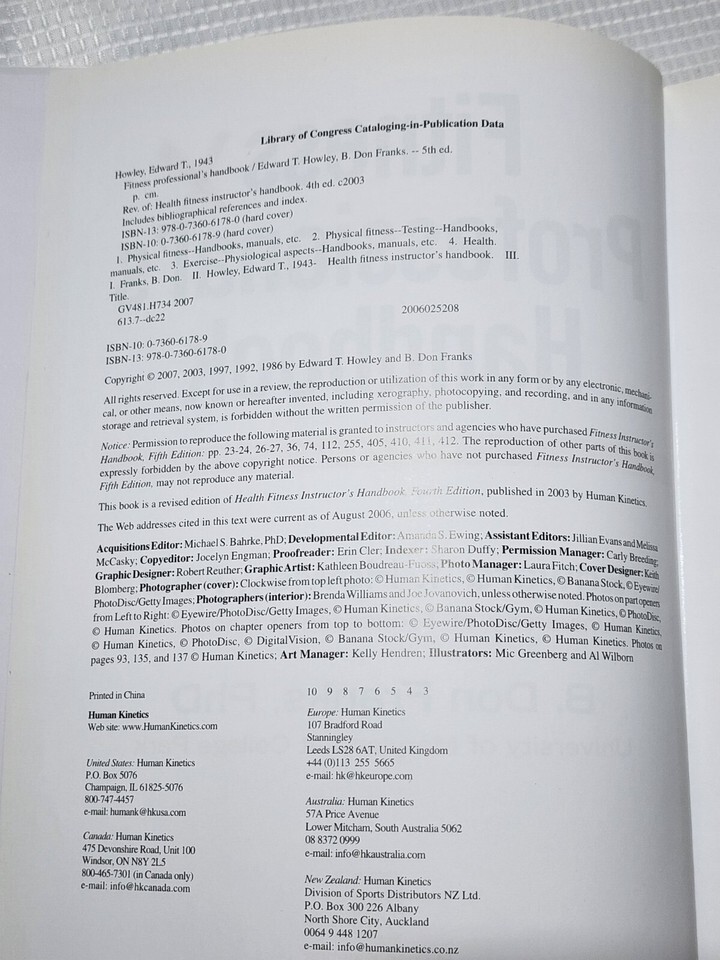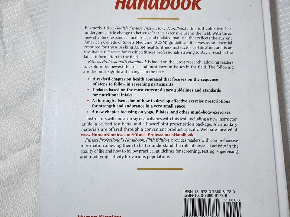 item: The Fitness Professional's Handbook (5th Edition) by Edward T. Howley and B. Don Franks is a comprehensive resource for fitness professionals. Published in 2007, this edition is an essential guide for personal trainers, strength coaches, and other fitness industry experts. It offers in-depth coverage of topics like exercise prescription, injury prevention, client assessment, program design, and the science of physical fitness. The book also includes practical applications for fitness training and rehabilitation, making it an invaluable tool for both new and experienced professionals. Rich in content, it provides a blend of theory, evidence-based practice, and real-world examples, helping fitness professionals deliver safe, effective, and personalized training programs to clients.