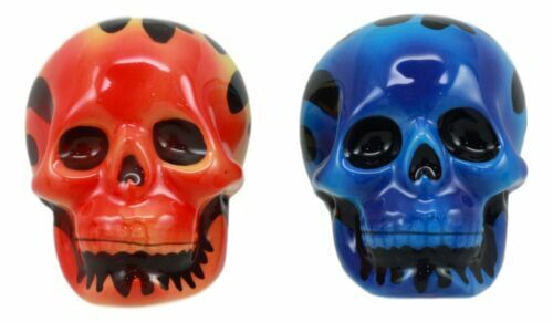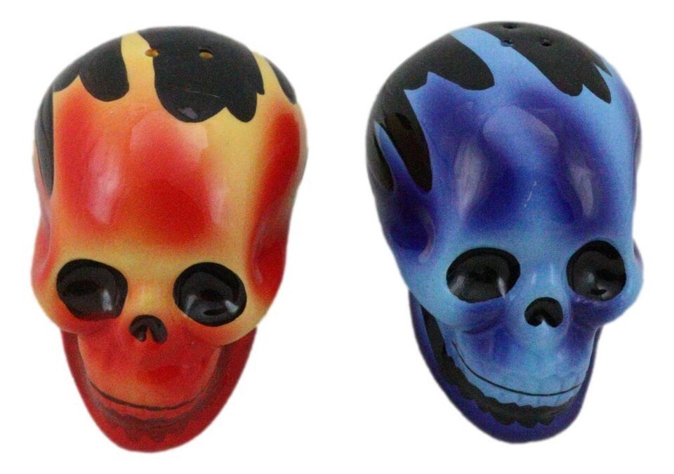 ? Now you can complete your Day of the Dead sugar skull collection with this wicked looking set of sugar skulls salt and pepper shakers. Each ceramic shaker is hand painted with a blue and orange burning flame finish. He makes a great collectible for any biker, goth fans, halloween decors or what have you!