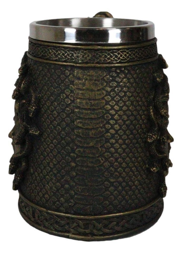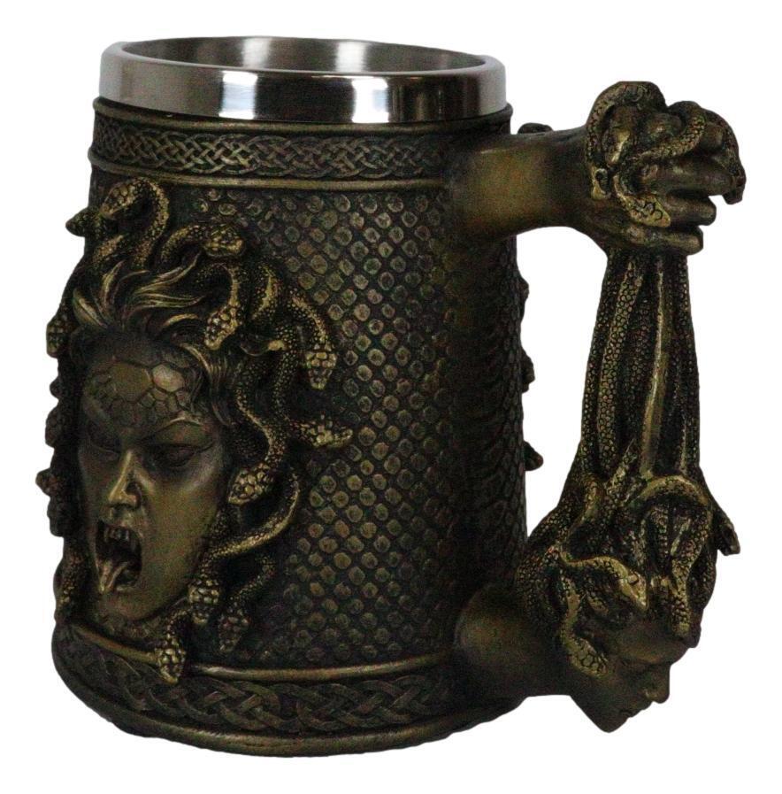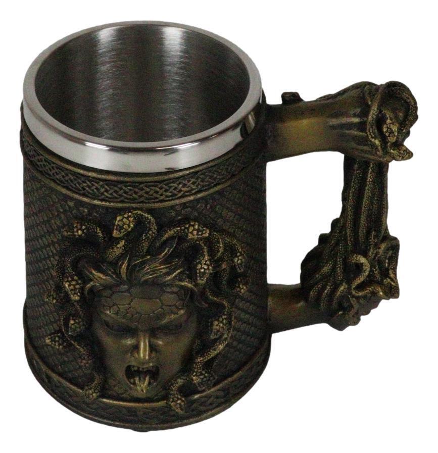 ? This Medusa Mug is made of fine polyresin topped with a stainless steel cup liner, hand painted and polished individually. The stainless steel liner is safe for drinking and washing. The colorful resin body should only be cleaned with warm cloth (without soap).