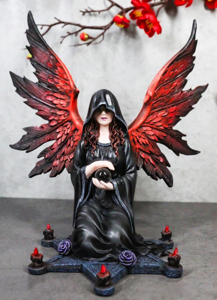 Hooded Cloak Dark Angel On Pentagram Ritual Floor Holding Crystal Ball Figurine