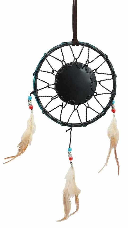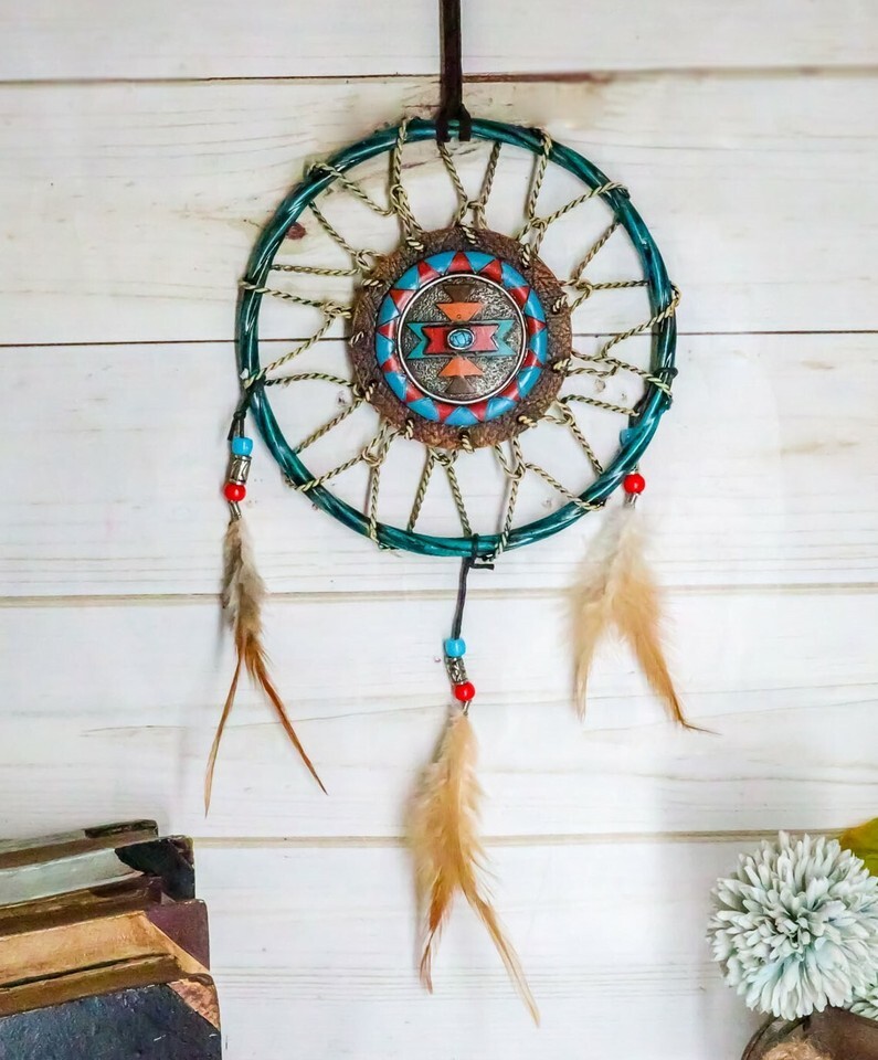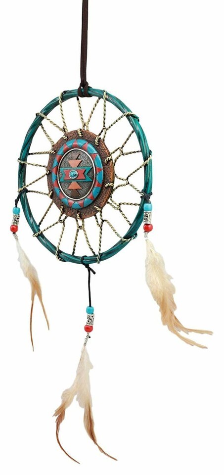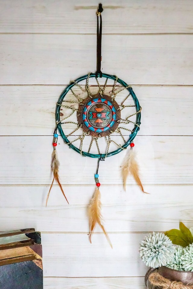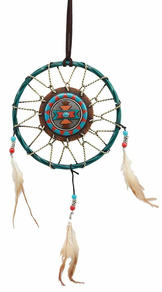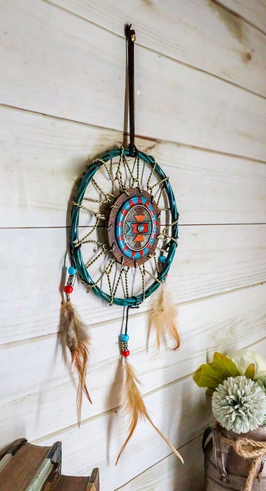 ? This Turquoise Themed Dreamcatcher contains 3 feathers and beads as ornaments. In the midsection of the web is a turquoise stone symbolizing health and protection. The Apache wore turquoise jewelry to enhance their accuracy and protect them in battle. Even today the belief in the power of turquoise is strong. If you wear a turquoise ring or necklace and you see a crack in the stone, to a Native American this would mean that the stone protected you from something that would otherwise have harmed