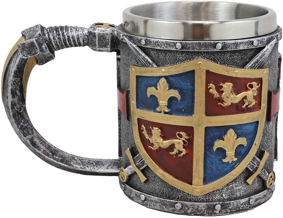 ? No matter what you are drinking, the final ingredient should always be a medieval drinkware, because everything tastes better when it is sipped in medieval style. This stylish drinkware features many medieval/renaissance elements revolving around Kings and Knights. You will see a coat of arms heraldry symbol consisting of the felur de lis, brave king lion, a shield crest, crossed swords and more! The drinkware is hand painted in striking colors of royalty and knighthood.