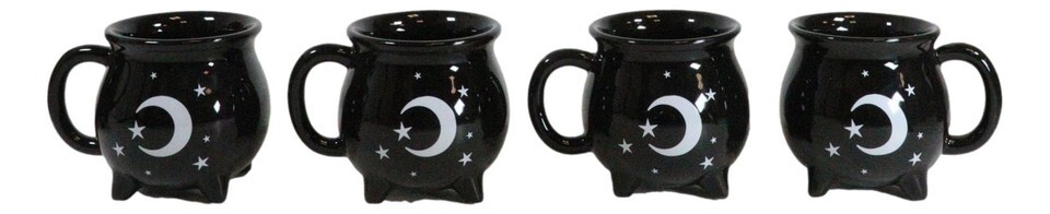 Wicca Sacred Moon And Stars Witches Brew Black Cauldron Teapot And 4 Cups Set