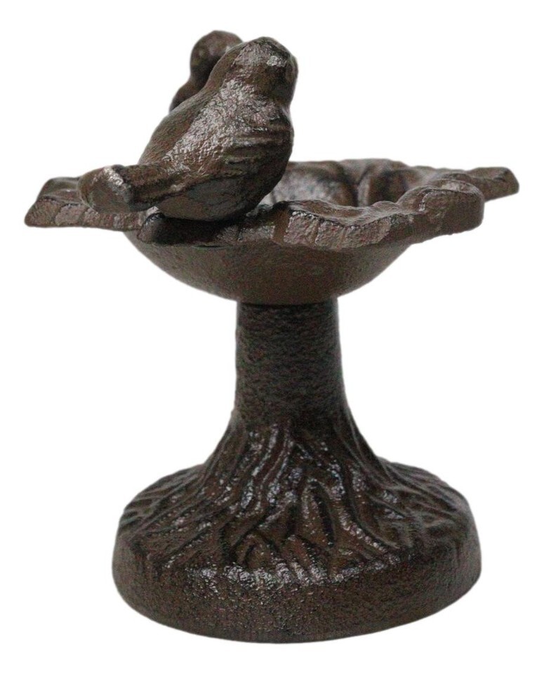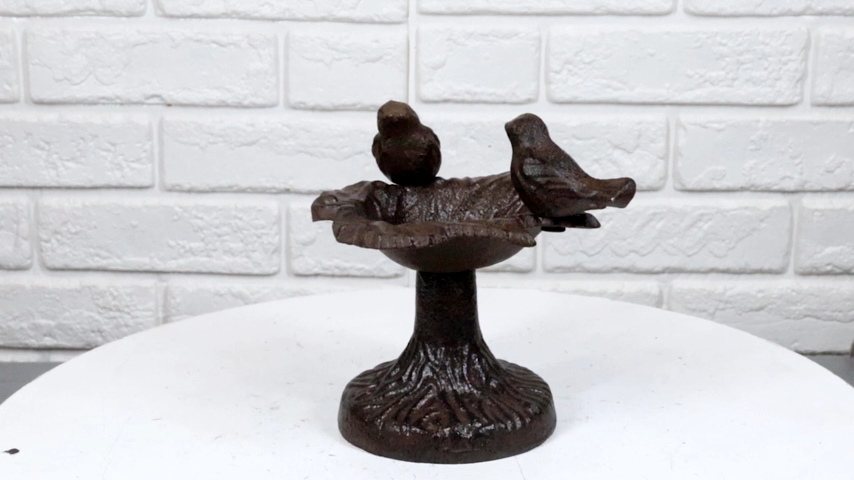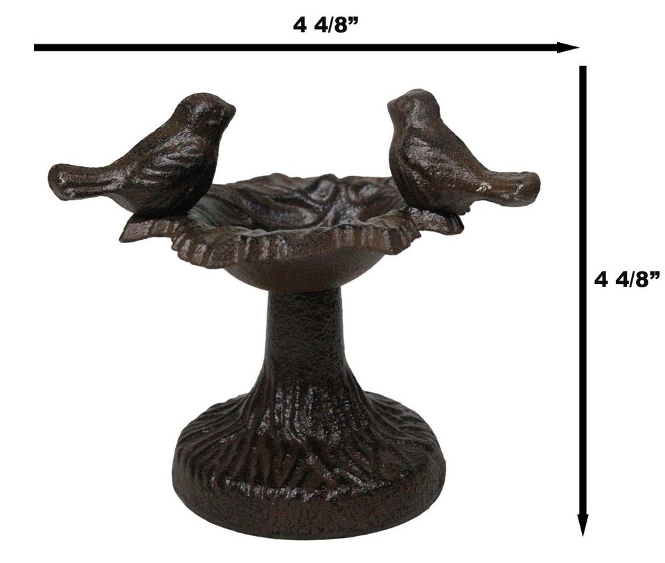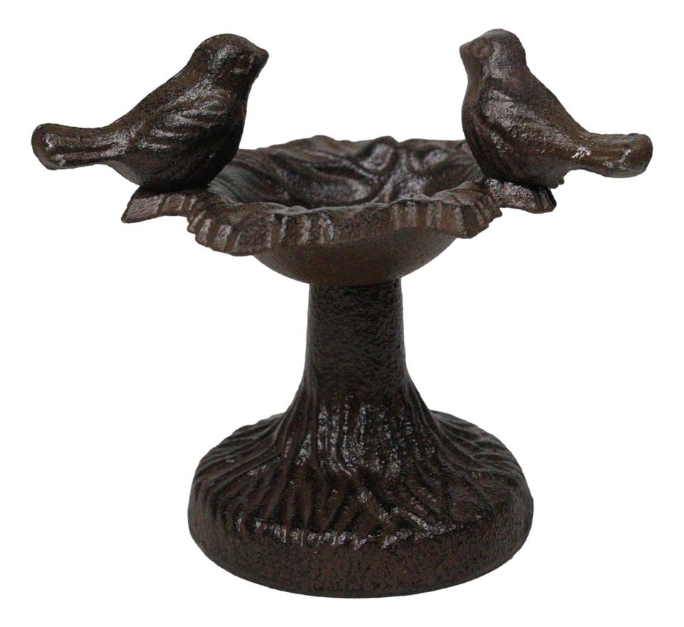 ? This lovebirds birdbath sculpture is made of cast iron, painted and finished in rustic bronze patina finish.
