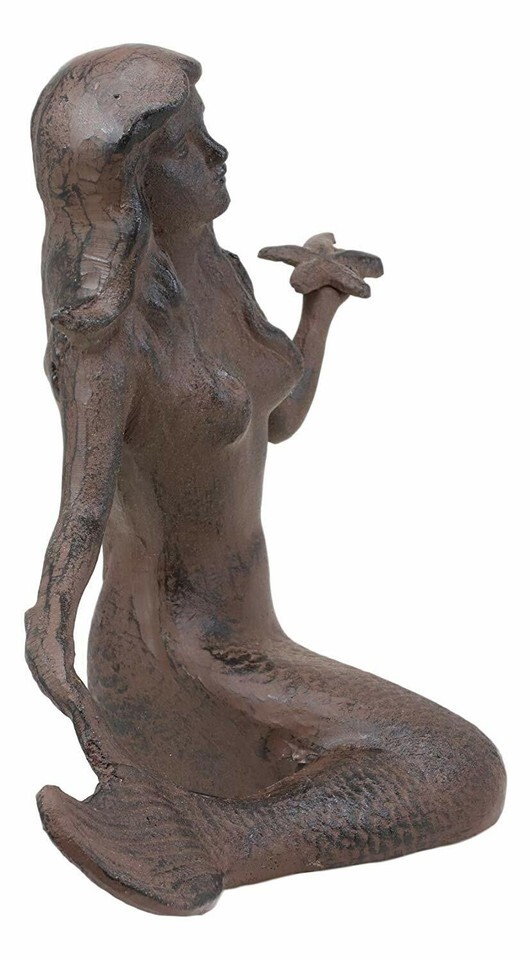 13"L Cast Iron Large Nautical Siren Mermaid Holding Starfish Statue Rust Finish