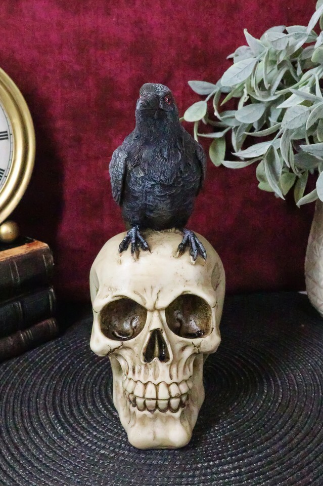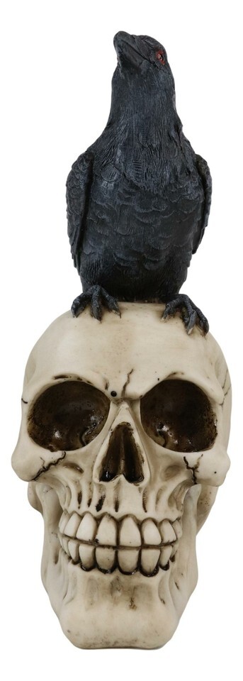 ? This is a realistic reproduction of the creepy scavenger bird atop a human skull. The raven's eyes are bloodshot red. A harbinger of doom, the raven perching on a skull provides foresight and wisdom to avoid the Evil Eye! It is quite a spooky sculpture to behold and will do great as a halloween or terror party centerpiece.