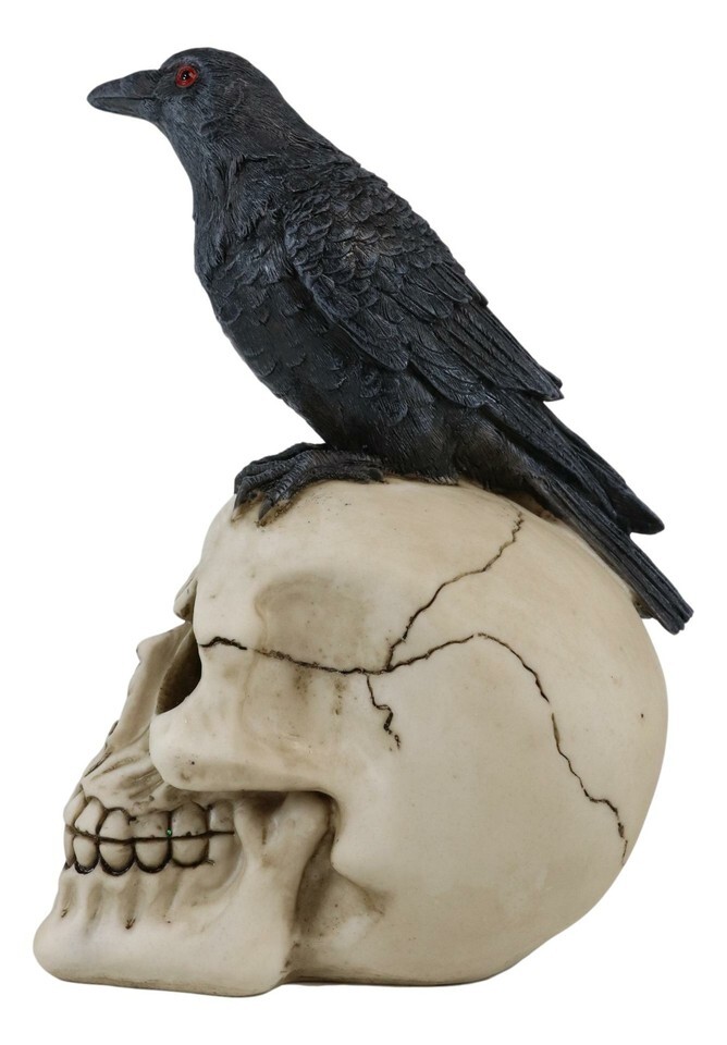 Ebros Quoth The Raven Nevermore Black Crow With Red Eyes On Macabre Skull Figurine
