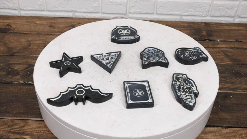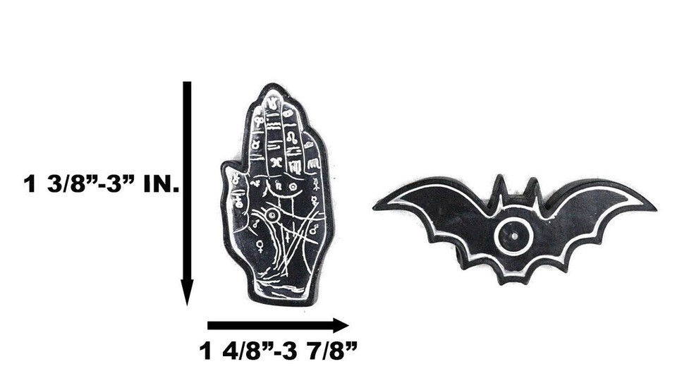 ? These Wiccan incense stick holders covers many elements of the wiccan religion; a witch's cauldron, hamsa palm, bat, feline cats, pentagram star, spell book and the evil eye pentastar.