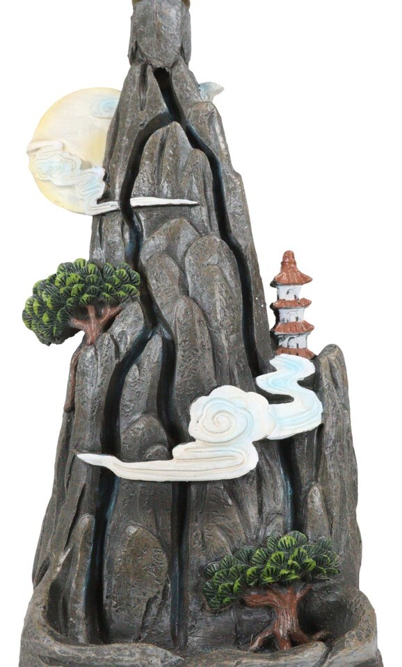 ? The Mountain Top Backflow Incense Burner is a mystical piece of art. Once lit, the backflow cone incense sends a shower of smoke from the mountain top, down to the base. The smoke, like water, pools around the creases, stepping stones and continues downward along the steep mountain side. A Pagoda temple is found at the mid height of the mountain, while clouds and the sun adds celestial elements to the scene.