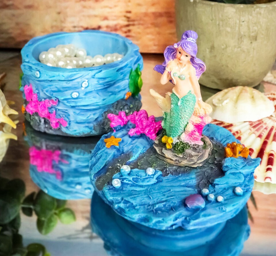 ? This beautiful mermaid jewelry box is made of polyresin, hand painted and polished individually.