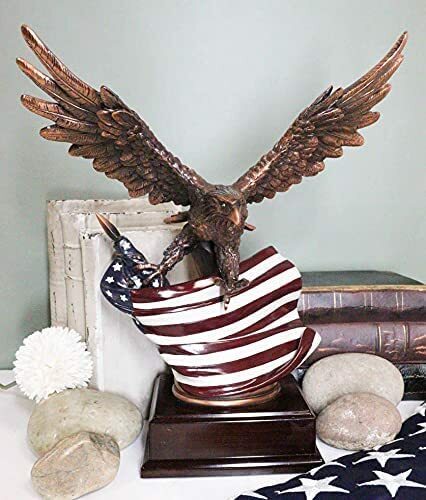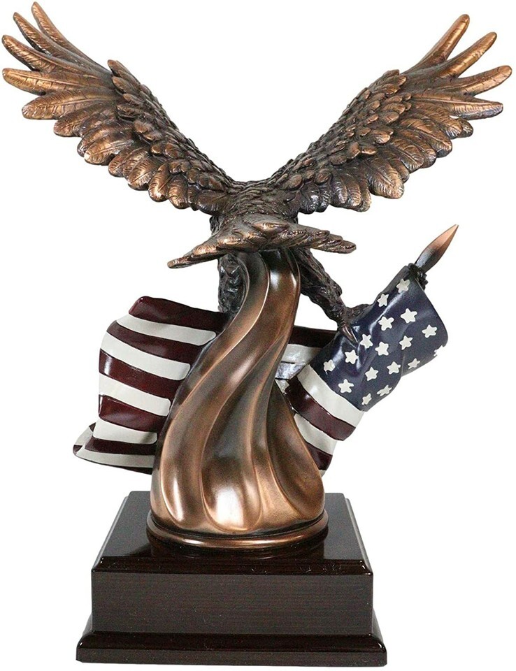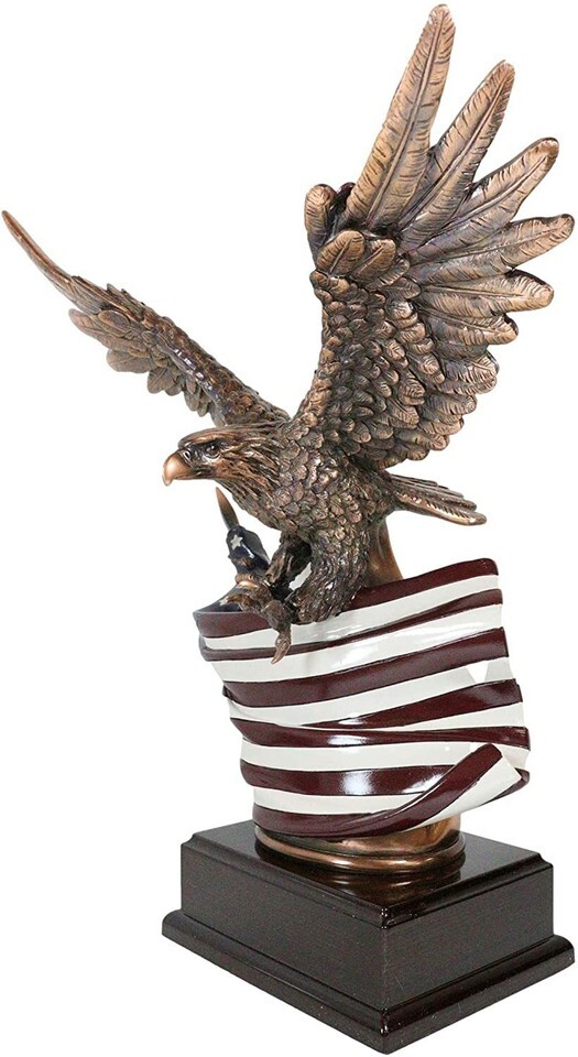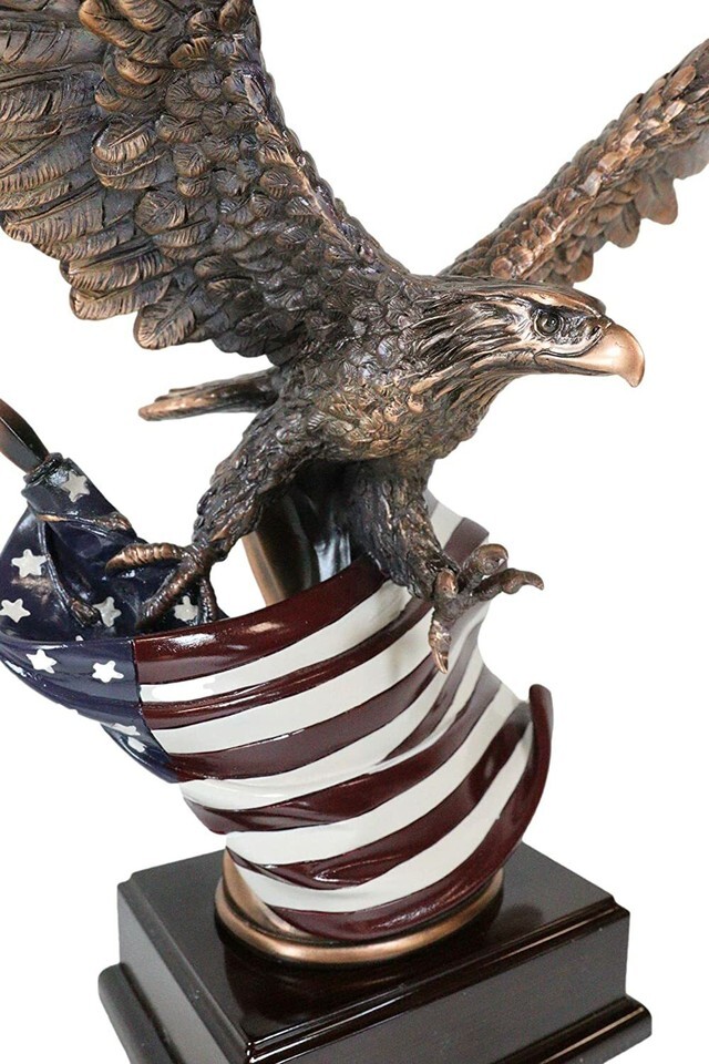 ? This Beautiful Bald Eagle Clutching On The American Flag Statue is made of the highest quality resin, undergoing the process of bronze electroplating giving it a uniform shine on the inside as well as the surface of the figurine. This process makes the figurine resemble the look of actual bronze but with much lesser weight. o add sculptural aesthetics and display worthiness, we add accent museum gallery display base to the sculpture.