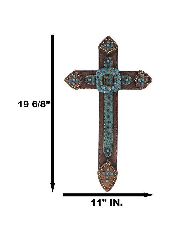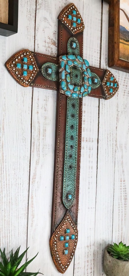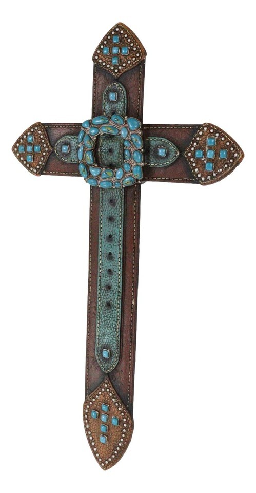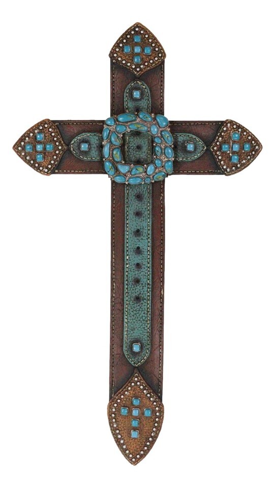? Add a touch of Old World western grit to your home or office setup with this wall cross. Starting with expert tooled faux leathering paintwork and craftsmanship, our sculptors have designed the cross to look like leather belts weaved together cohesively in a Western style. Turquoise rocks are hewn together, aligned beautifully at the center to form what looks like a buckle.