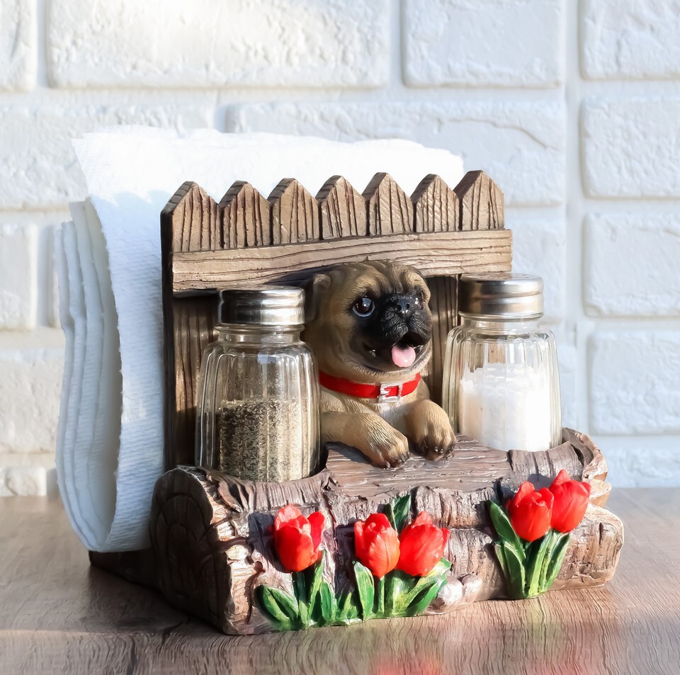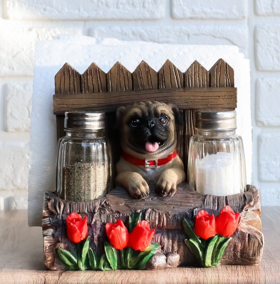 Panting Pug Dog By Fences & Flower Bed Dinner Napkin Salt Pepper Shakers Holder
