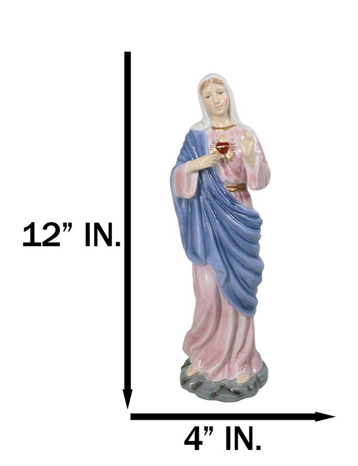 ? This Sacred Heart Of Mary sculpture is designed to represent her joys, sorrows, virtues, obedience to God and maternal love for Jesus Christ. Our sculptors and painters work together to bring this beautiful statue to form in 3D on bone china porcelain medium.