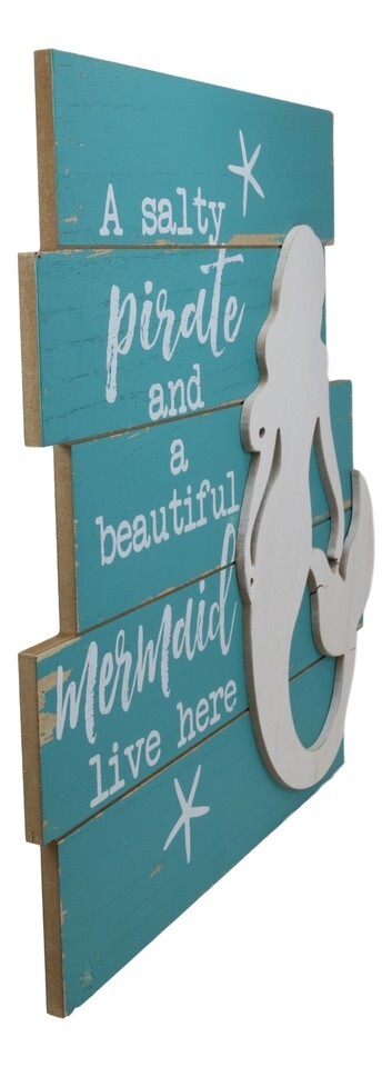 ? Featuring an off white mermaid silhouette, the wall sign reads "A Salty Pirate And A Beautiful Mermaid Live Here". The words of the phrase are split up into 5 distressed wood like blue slates. The wall sign hangs conveniently on a single hook (see back photo).