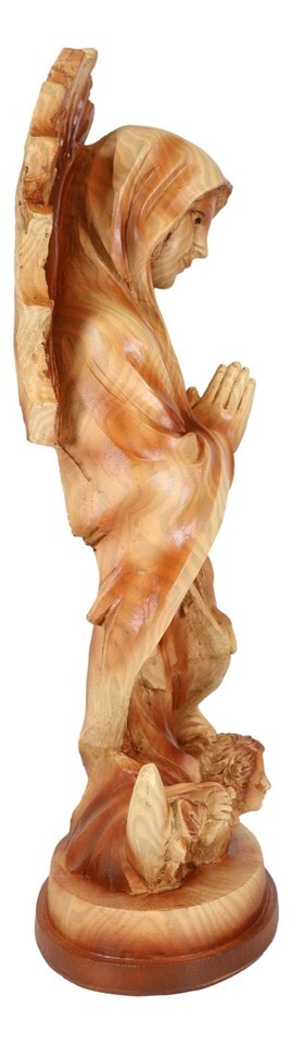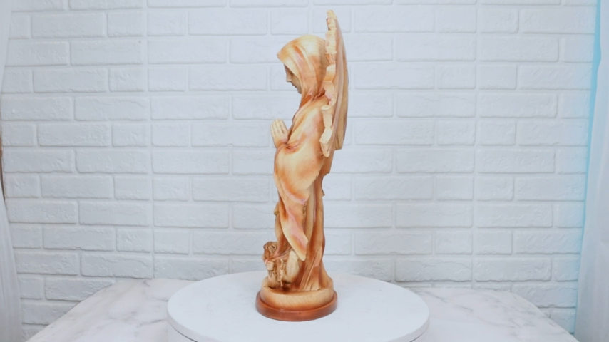 ? This Our Lady of Guadalupe Sculpture is made of designer composite resin, hand painted and polished individually. The art of creating a wooden finish to resin is a recently discovered technique which gives you the best of both worlds; the rustic natural feel and look of wood and the sculptural details that can only be achieved with resin. This sculpture will look new for many years to come, and the best part is it will not fade or crack/split (due to dryness) like wood does over a period of time