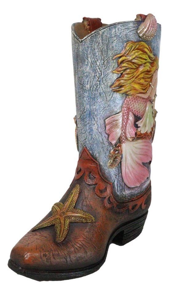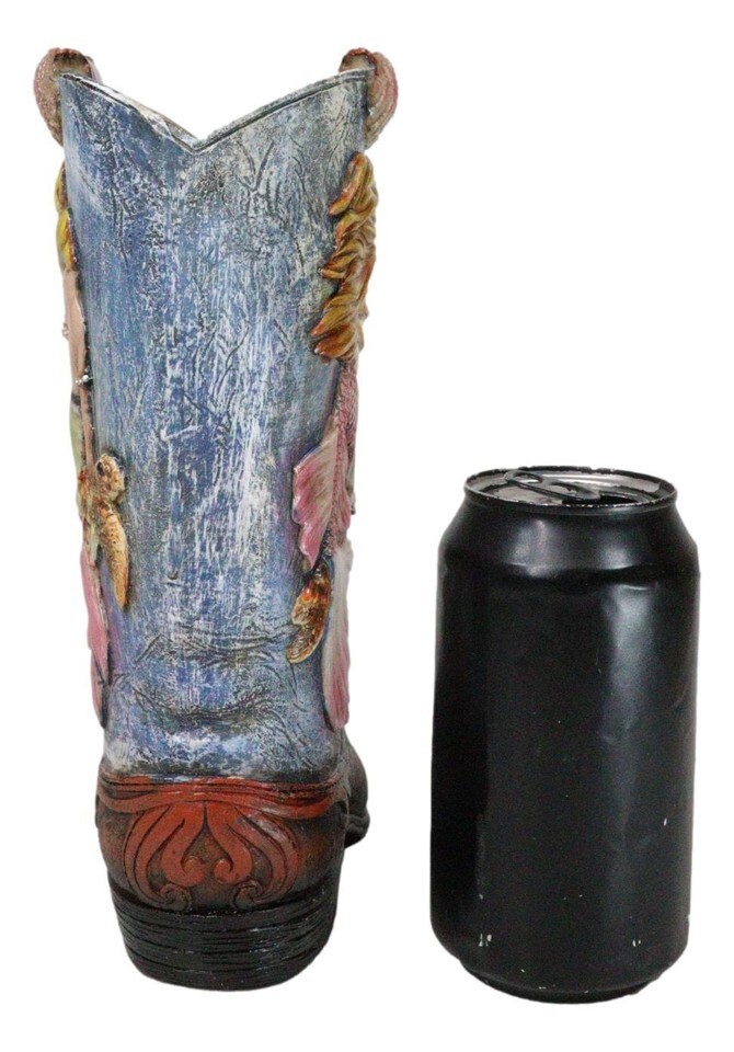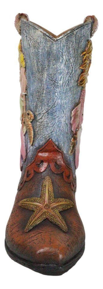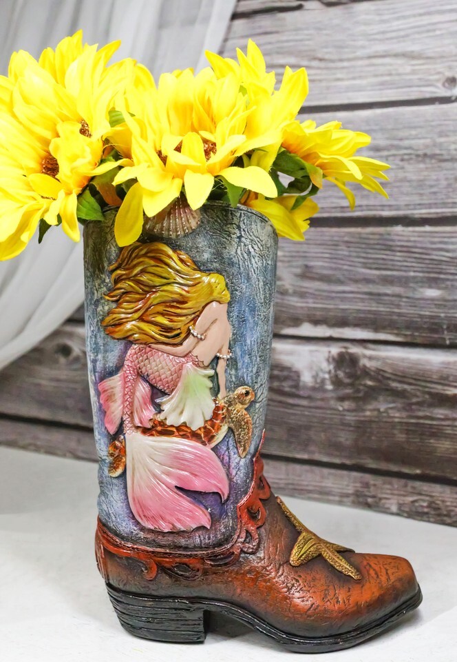 ? Introducing the Mermaid With Starfish and Sea Turtle Cowgirl Boot Vase, a whimsical and enchanting decor piece that combines the rustic charm of Western style with the mystical allure of the sea. This unique vase is shaped like a cowgirl boot, featuring detailed faux leather craftsmanship. Adorning the boot is a beautifully sculpted mermaid damsel, accompanied by starfish and a sea turtle, capturing the essence of underwater wonder.